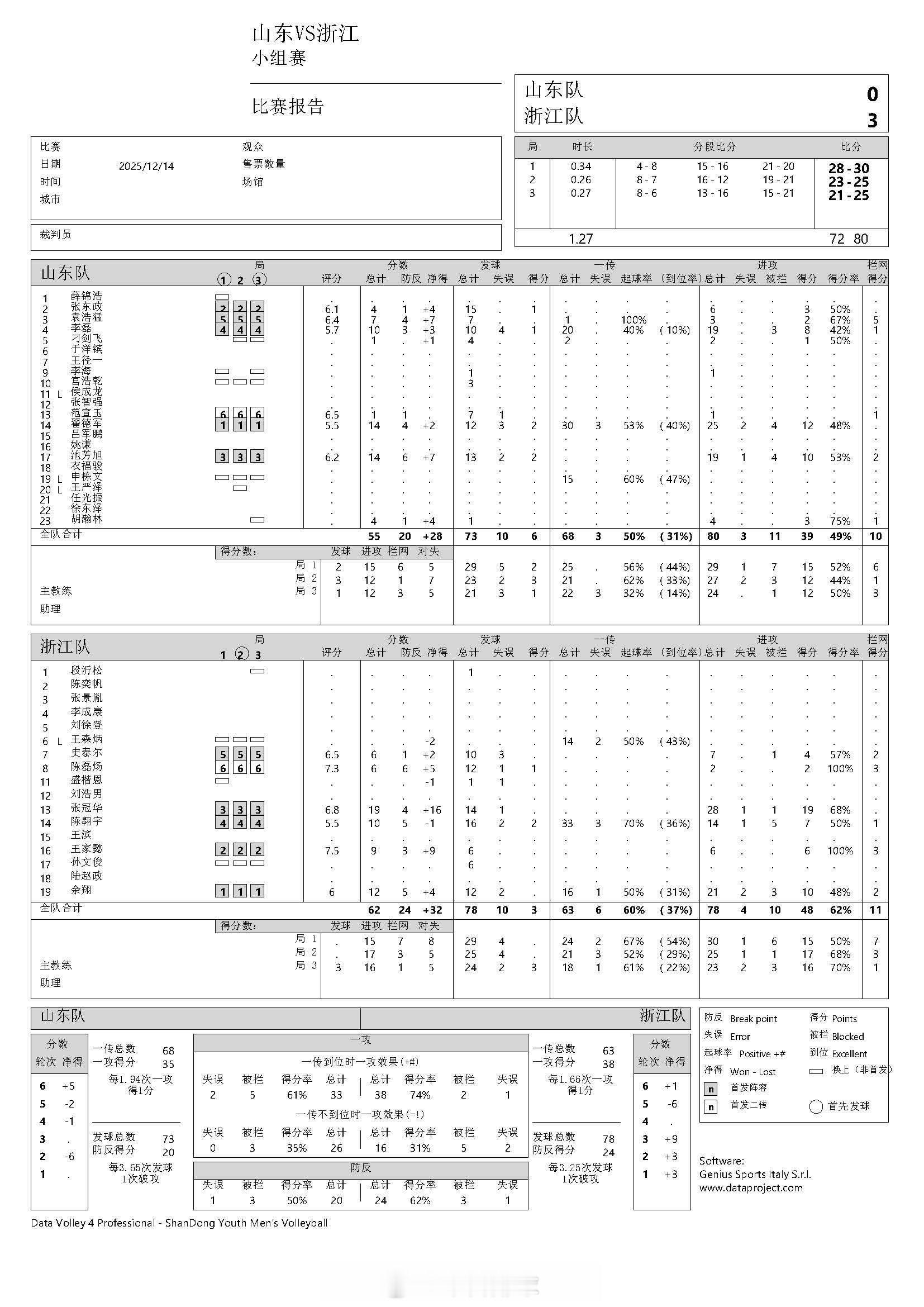 【中国男排超级联赛 山东0-3浙江得分统计】北京时间14日晚上,2025-2026赛季A级常规赛第1轮,青岛兴轮呦呦在主场以0-3(28-30, 23-25, 21-25)不敌浙江振德。翟德军14分(25扣12中、发2),池芳旭14分(19扣10中、拦2发2),李磊10分,袁浩猛7分;张冠华19分(28扣19中),余翔12分(21扣10中、拦2),陈翱宇10分(14扣7中、拦1发2),王家懿9分,史泰尔、陈磊炀各6分。扣球38-43、拦网10-11、发球6-3、对手失误18-23。