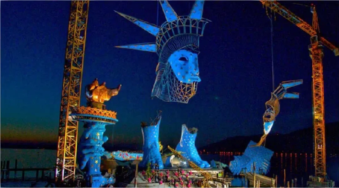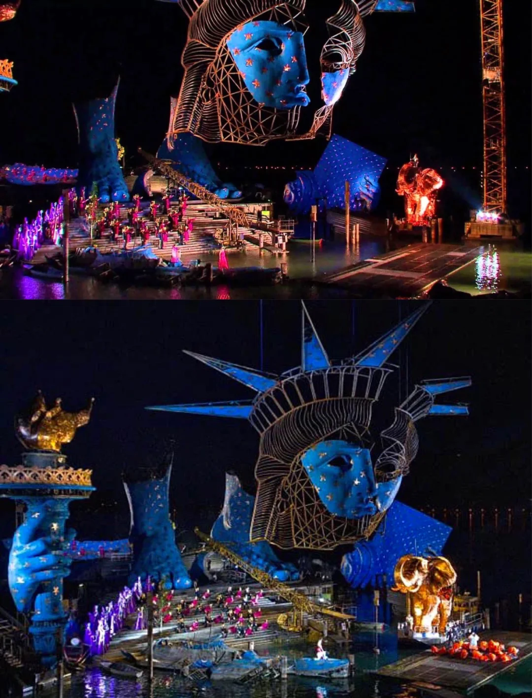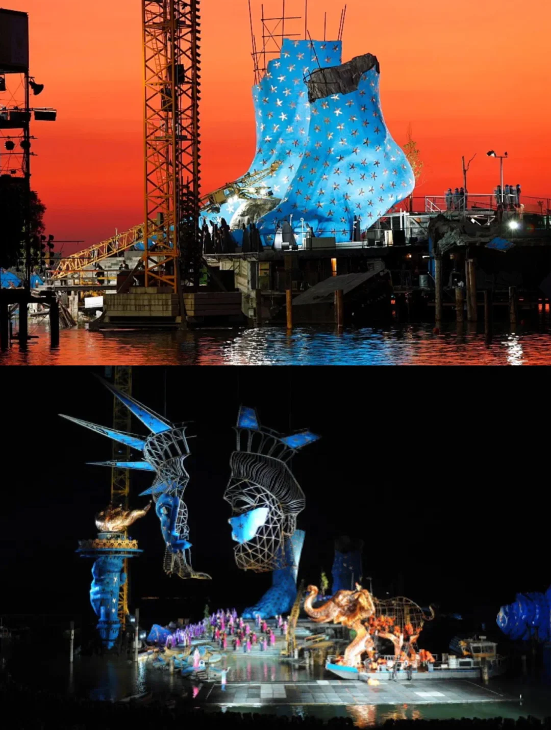 🗽2009~2010年上演的是威尔第的作品《阿依达》 🗽《阿伊达》舞台主要由一座被解构的蓝色自由女神像的脸部构成 🗽舞台边上还有金色大象等造型,充满怪诞色彩 🗽两只15米高的足部造型竖立在舞台后端