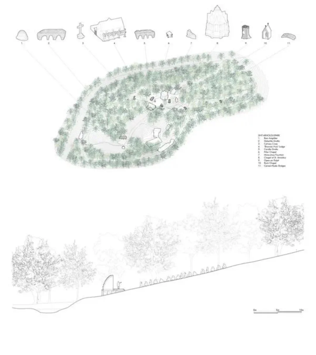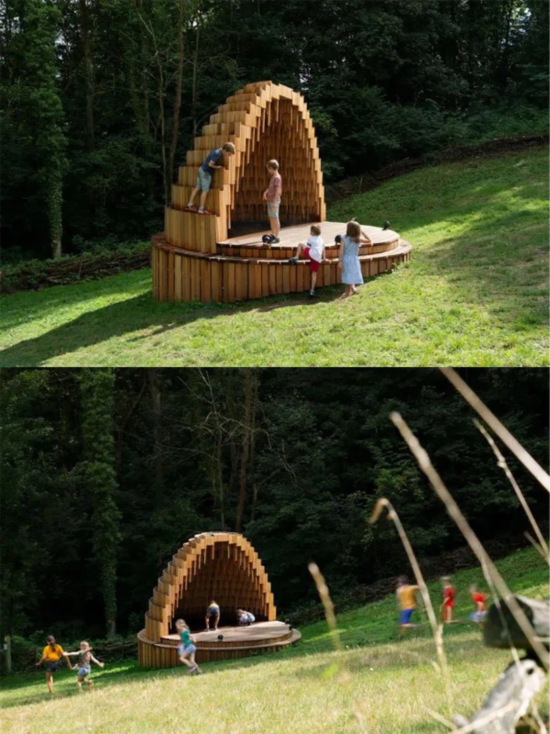 在比利时首都布鲁塞尔以西61公里左右的霍伦德里斯(Hollendries),有这样一处古老的公园:sint arnolduspark。它是19世纪末建立,因独特天然泉水而闻名。现在这个历史悠久的公园内,新增这样一处景观:它是休闲建筑,它是舞台场景,它也是引起游客们反思水在景观中重要作用的雕塑。