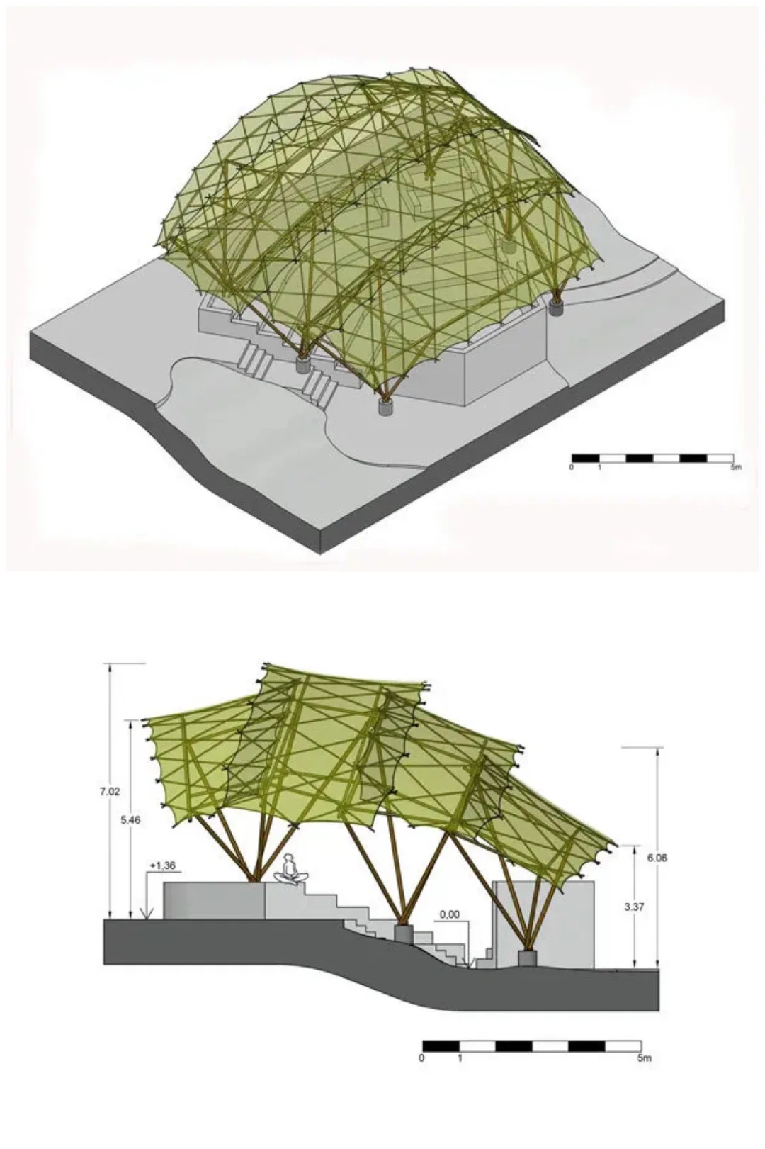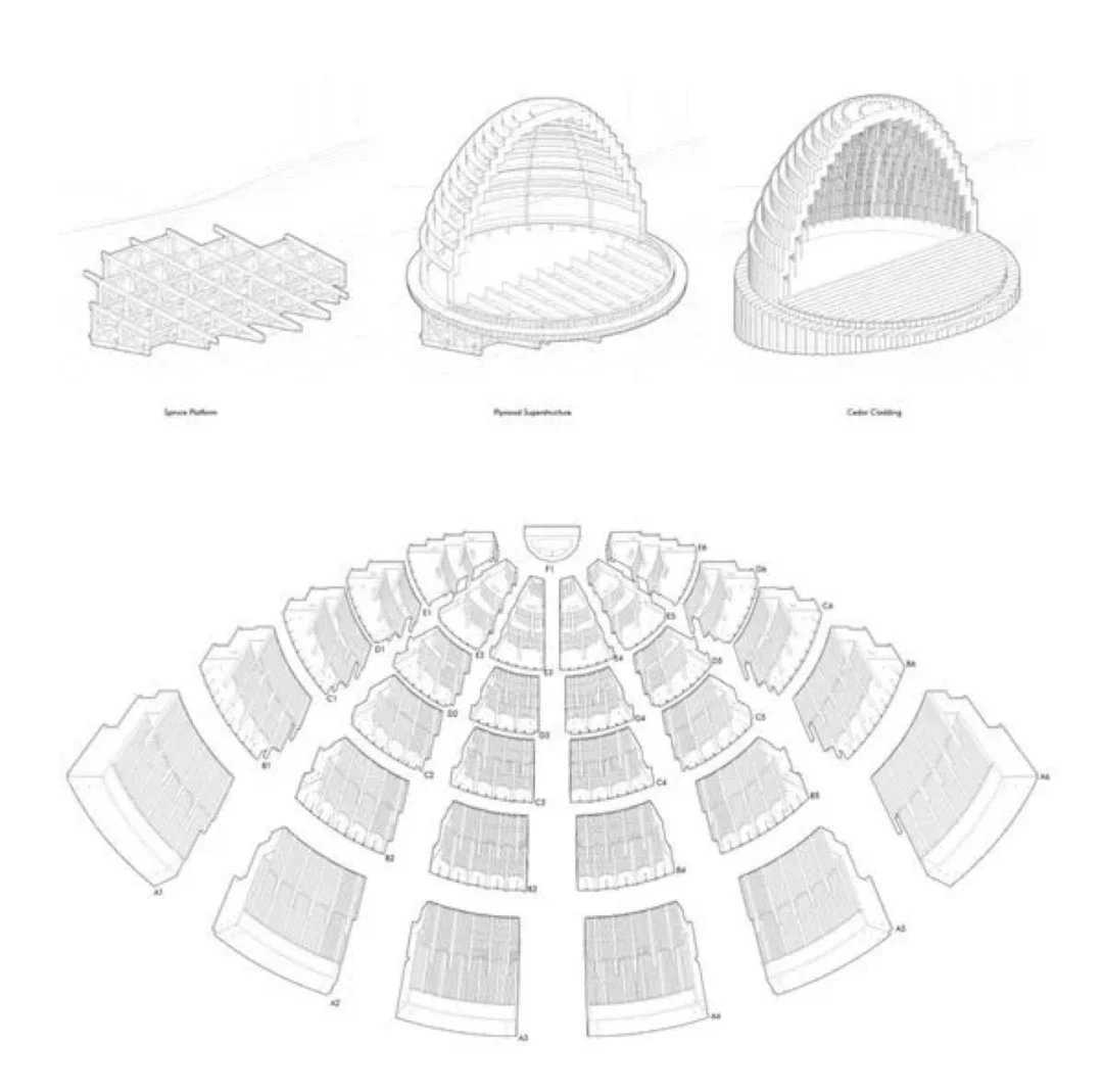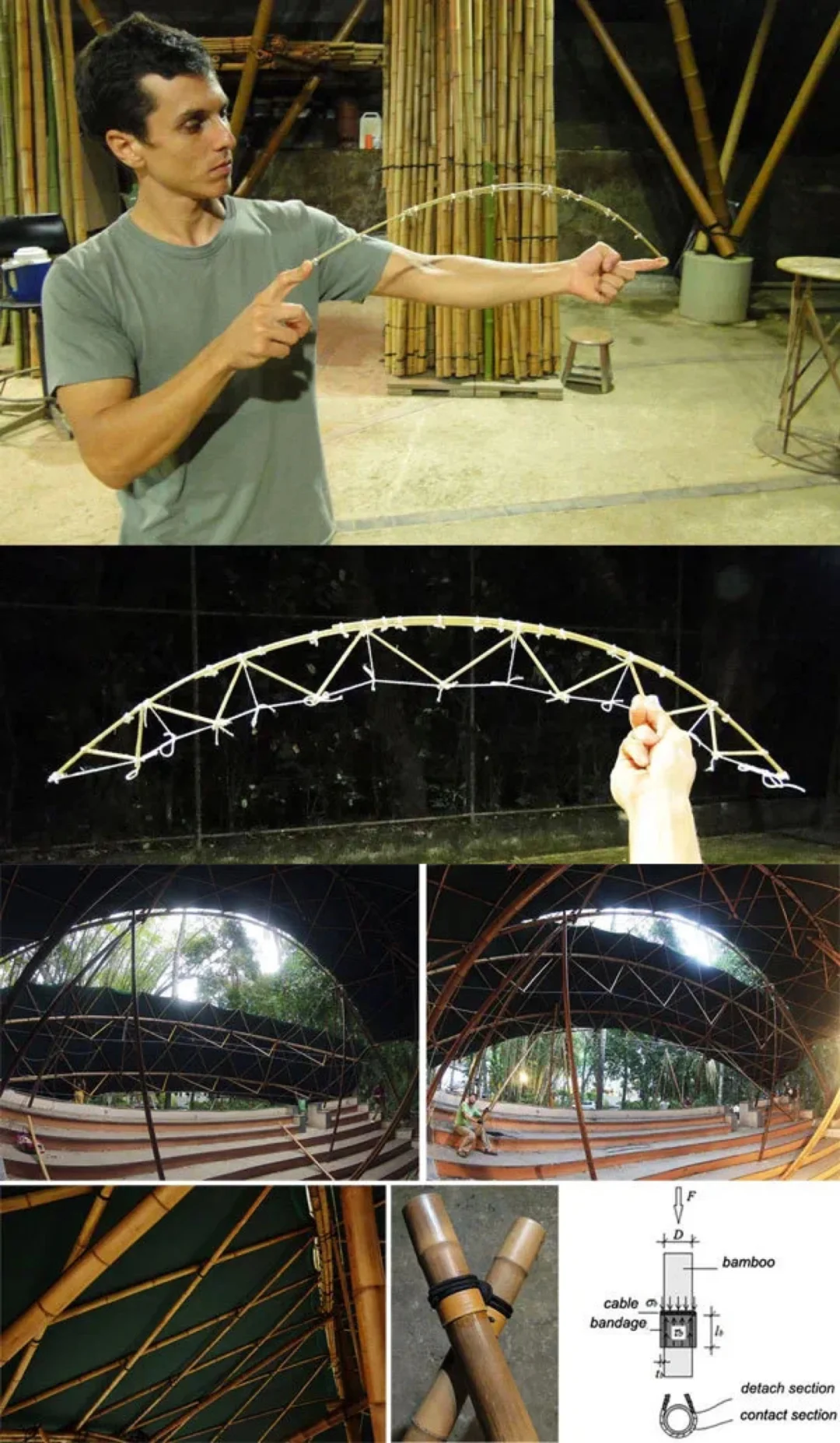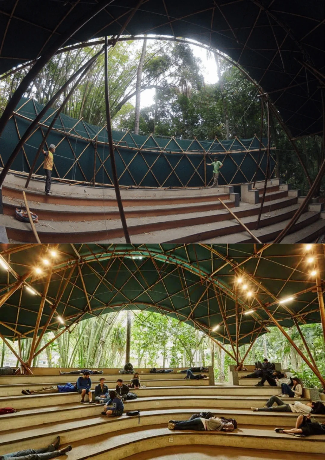 在巴西里约热内卢一所天主教大学校园内,有这样一个圆形可自由移动屋顶的多功能舞台建筑。它的跨度为17 X 12米,总覆盖面积为200平方米,设计师以竹为原料,通过使用物理模型和计算机模型进行交互,在屋顶采用弯曲和紧缩效果较好栅格网格混合竹结构,既能承受外部较大的重力,又能以两个竖立的脚架实现支撑功能。