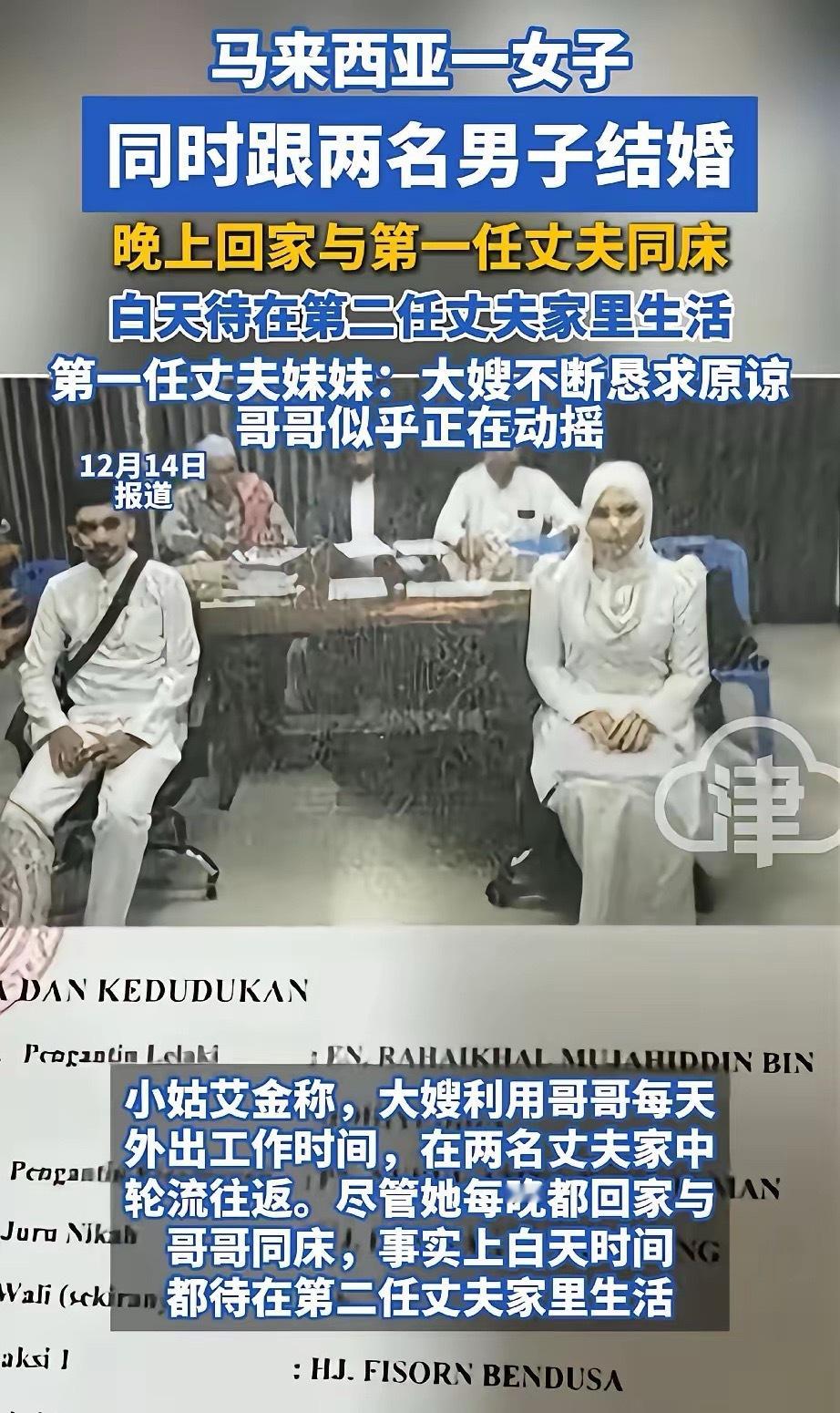 “不服不行”,马来西亚一女子同时和两名男子结婚,晚上和第一个丈夫一起睡觉,白天又跑到第二个丈夫家里生活,一来一去竟然没有一个人发现。还好第一个丈夫的妹妹眼尖,发现了这个秘密,她表示:大嫂利用哥哥每天外出工作时间,在两名丈夫家中轮流往返。尽管她每晚都回家与哥哥同床,事实上白天时间都待在第二任丈夫家里生活。最离谱的是,事件曝光一周后,大嫂依然拒绝搬离第一个丈夫家里,且向警方报案,指控自己的小姑子骚扰她。在妻子不断恳求原谅的攻势之下,第一任丈夫也开始动摇,仿佛就要接受这个事实。不得不说,外国人真