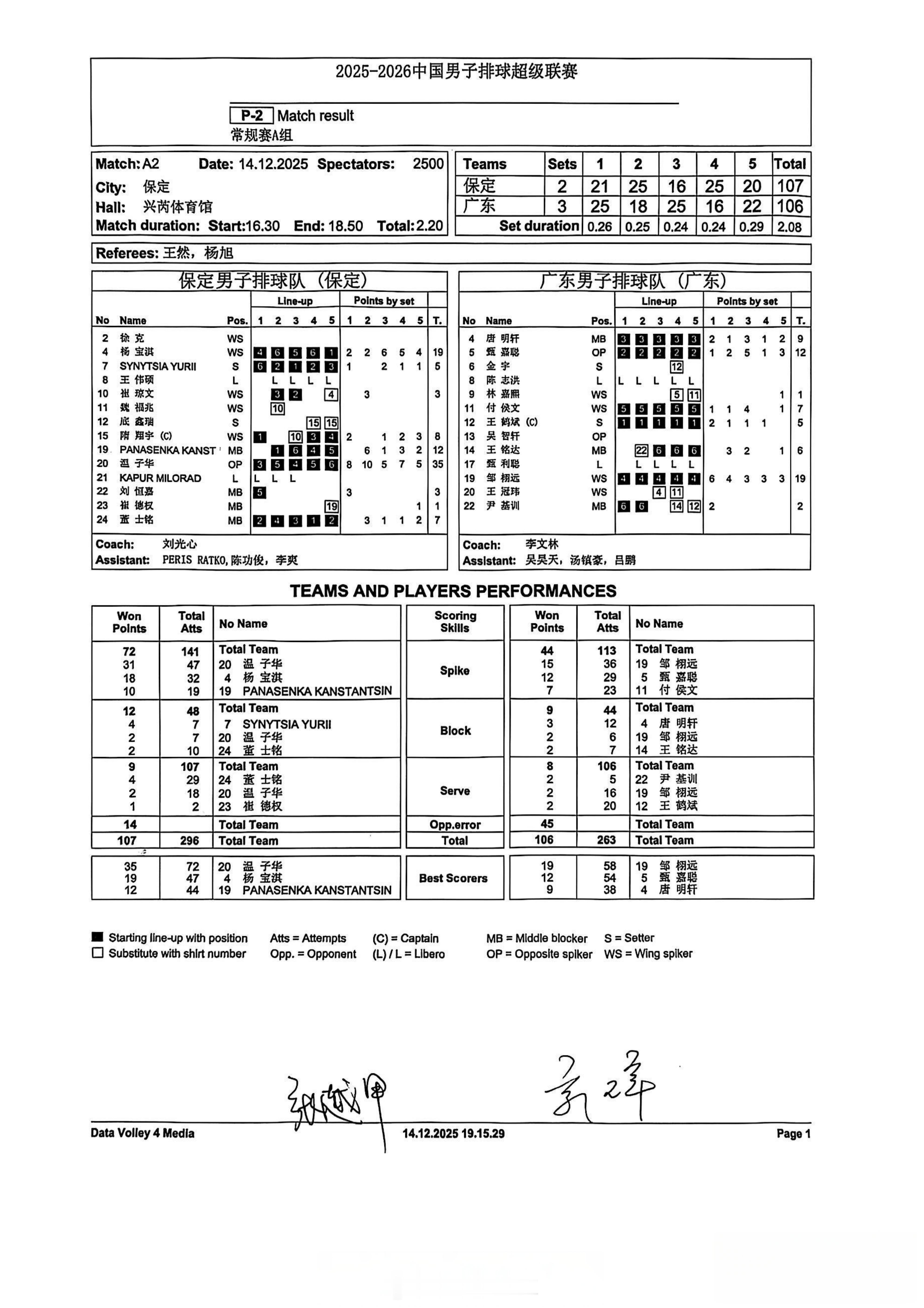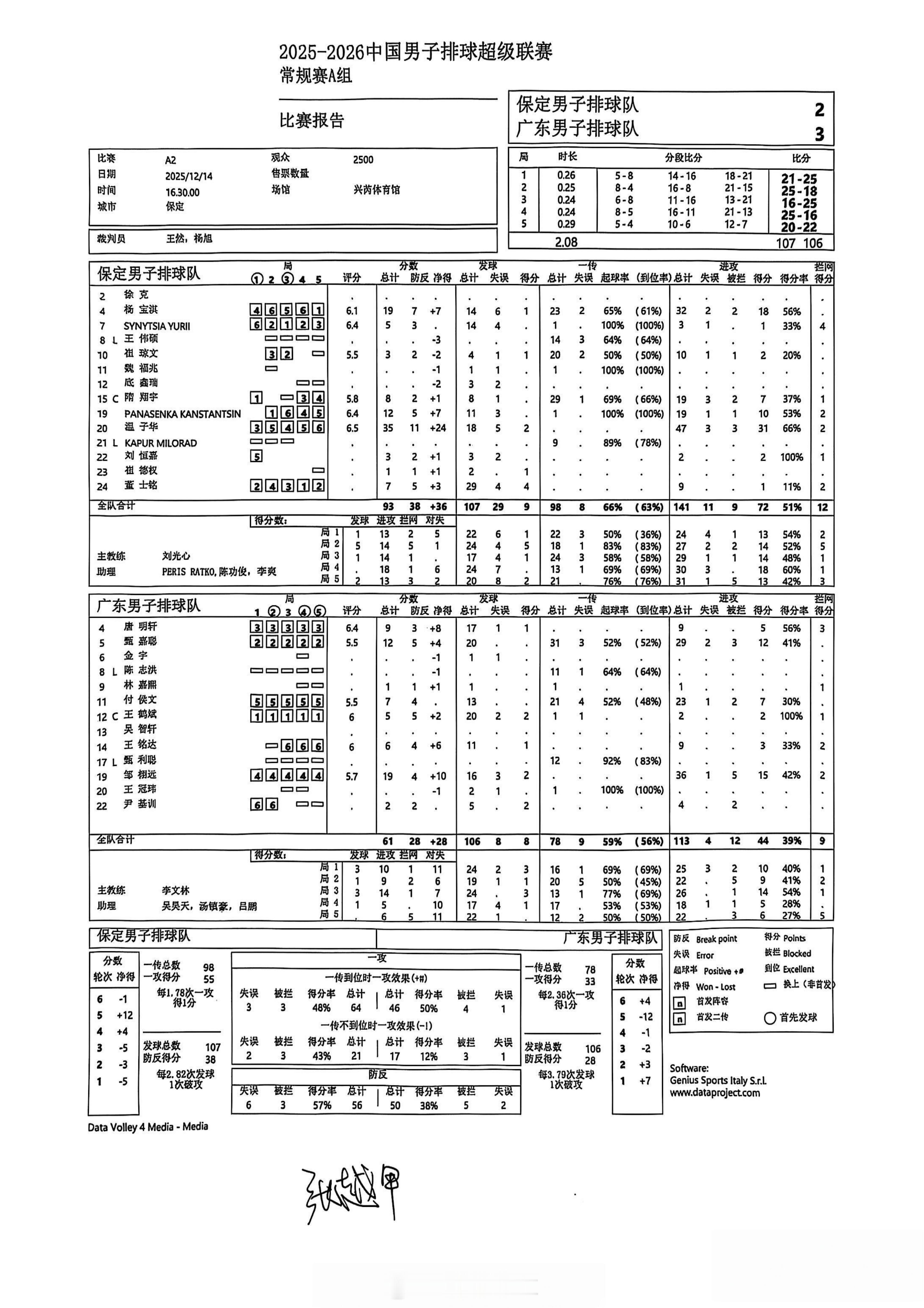 【中国男排超级联赛 河北2-3广东得分统计】北京时间12月14日傍晚,河北保定,2025-2026赛季A级常规赛第1轮,保定沃隶在主场以2-3(21-25, 25-18, 16-25, 25-16, 20-22)不敌广东台山和力。温子华35分(47扣31中、拦2发2),杨宝淇19分(32扣18中、发1),怕纳森卡12分(19扣10中、拦2),隋翔宇8分,董士铭7分,辛尼察5分(拦4);邹栩远19分(36扣15中、拦2发2),甄嘉聪12分(29扣12中),唐明轩9分(9扣5中、拦3发1),付候文7分,王铭达6分,王鹤斌5分(拦1发2)。扣球72-44、拦网12-9、发球9-8、对手失误14-45。