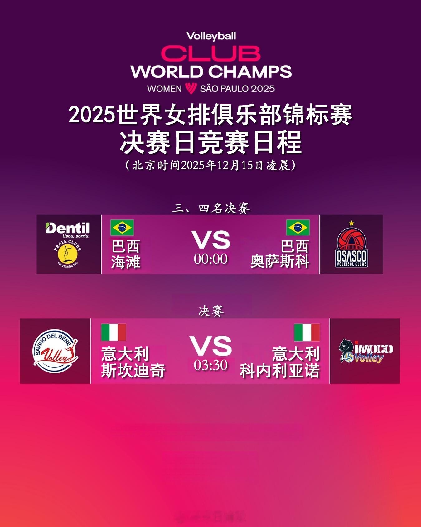 2025女排世俱赛 决赛日竞赛日程(北京时间):12月14日(日)+1 00:00 三、四名决赛 巴西海滩 vs 巴西奥萨斯科+1 03:30 决赛 意大利斯坎迪奇 vs 意大利科内利亚诺