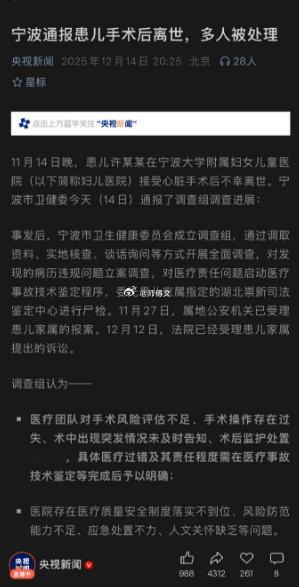宁波通报患儿手术后离世 这已经判定为医疗事故了,所以请问怎么让小宝宝活过来?家人该怎么接受啊,这种案例好多,大部分都是胳膊拧不过大腿,最后不了了之,看到了处罚总归是好现象。。。