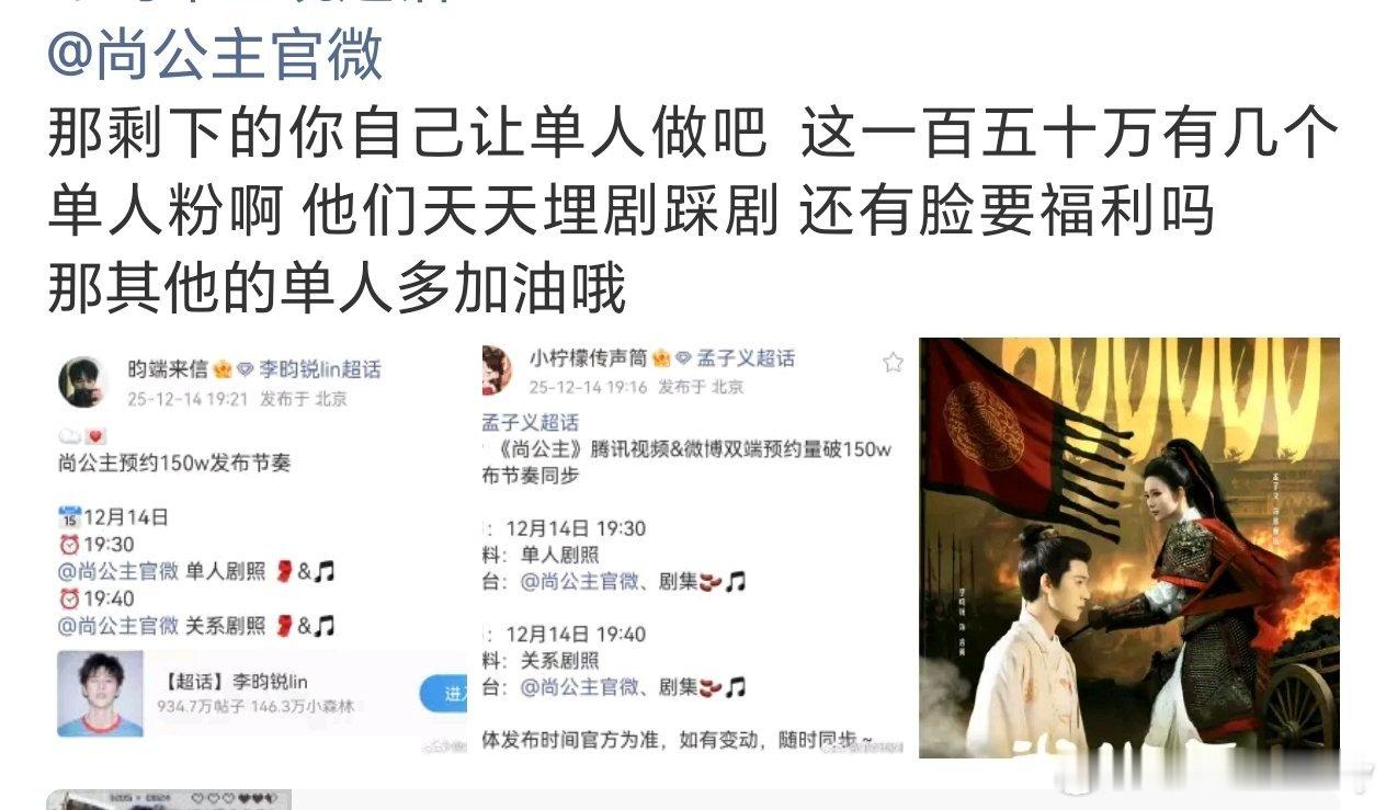 尚公主尚公主剧照因为《尚公主》今天放的是单人物料,李昀锐和 孟子义的cp粉昀牵孟绕就不乐意了,表示唯粉没几个粉,以后书局都留给他们做吧!那么问题很快就来了,既然李昀锐和孟子义都没几个唯粉,那为啥孟子义星光值是李昀锐的三倍,cp粉不是说好要一碗水端平吗?