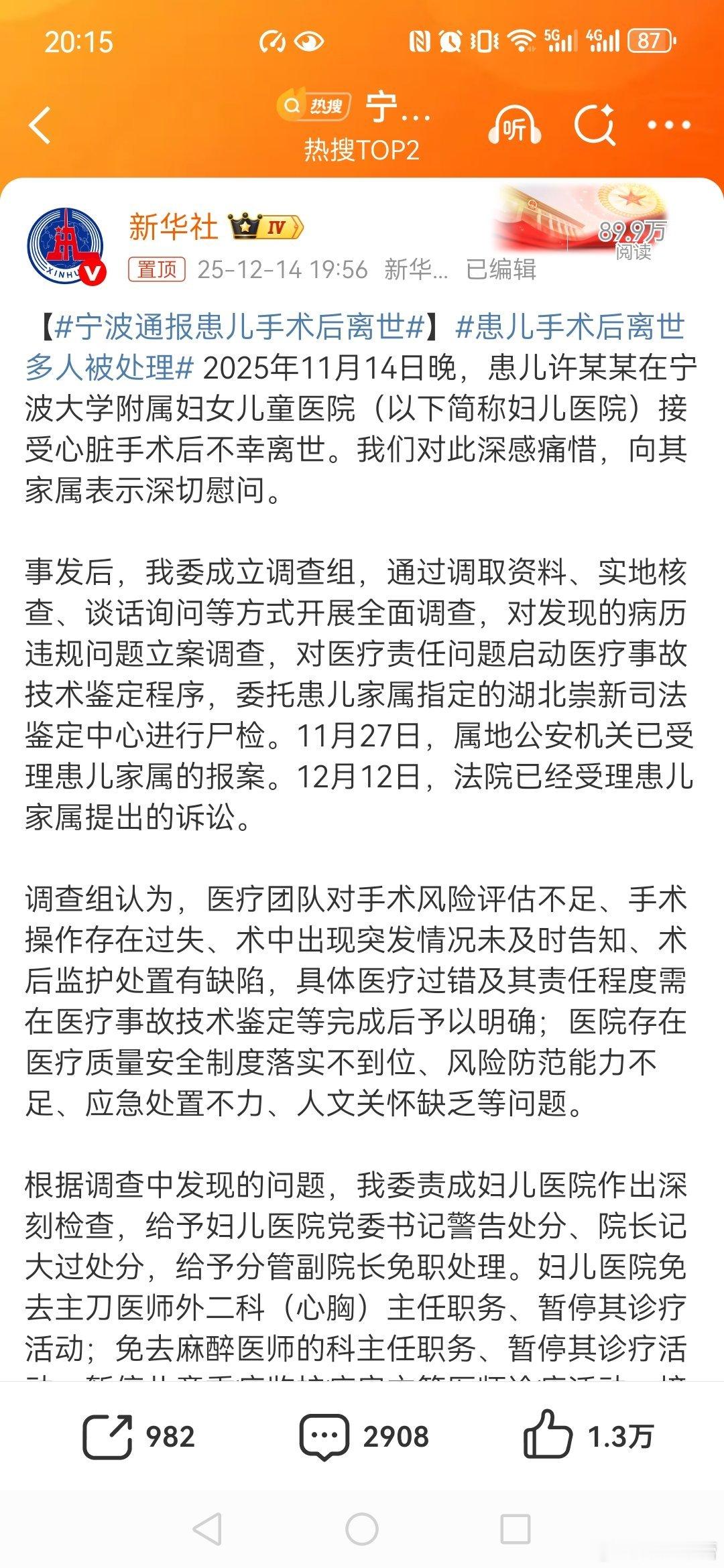 官方回应患儿手术离世监控缺失【宁波通报患儿手术后离世】患儿手术后离世多人被处理持续关注小洛熙事件 官方已经认定: 医疗团队对手术风险评估不足、手术操作存在过失、术中出现突发情况未及时告知、术后监护处置有缺陷,具体医疗过错及其责任程度需在医疗事故技术鉴定等完成后予以明确;医院存在医疗质量安全制度落实不到位、风险防范能力不足、应急处置不力、人文关怀缺乏等问题。 “一个用于实时监控的广角全景摄像头,未配置存储介质,不具备回放功能”——不能不说,这是个遗憾,对于事故调查而言,这个摄像头不可谓不关键,设置为可回放,合情合理,势在必行。
