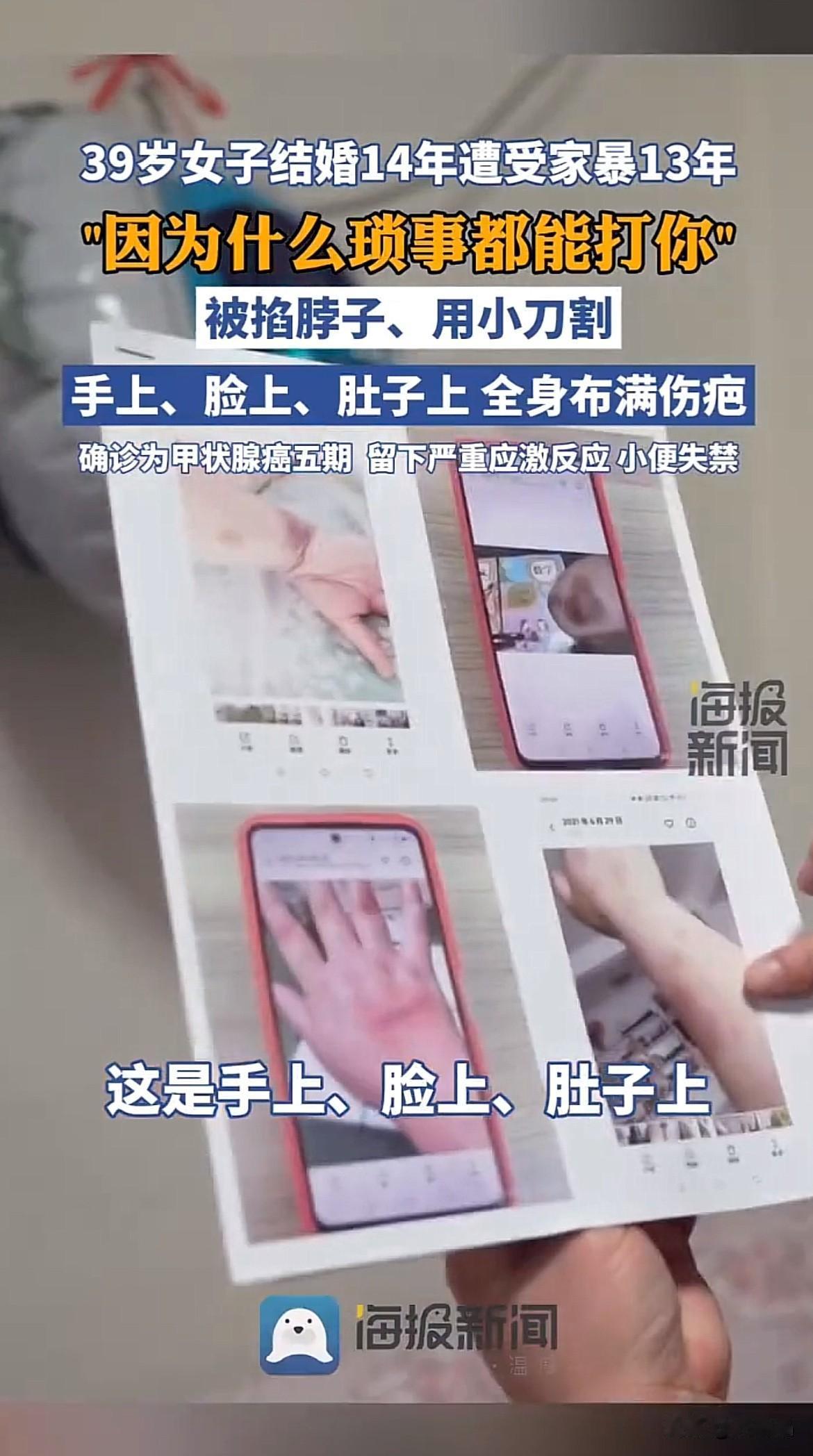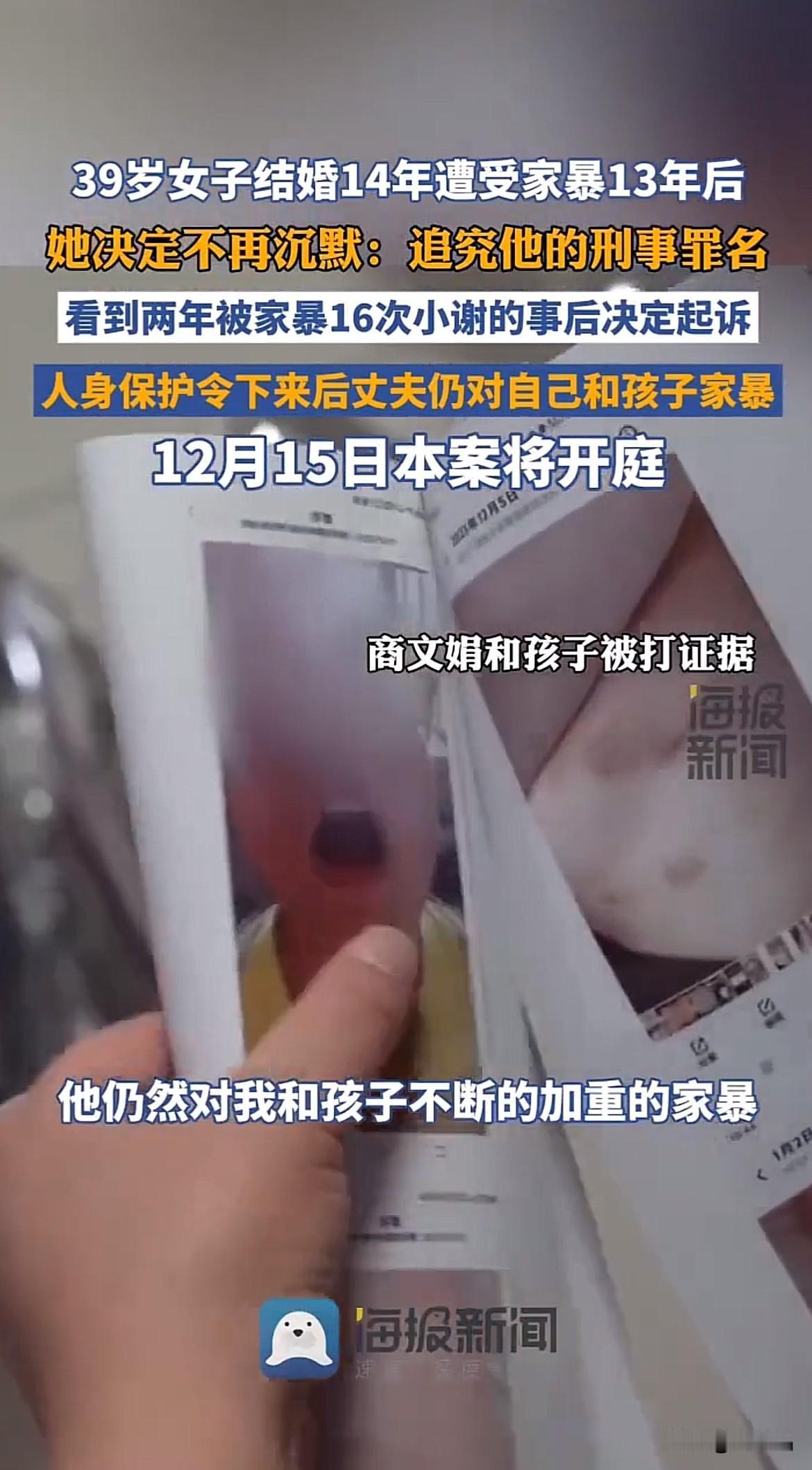 湖北恩施,商女士和老罗网恋半年闪婚,本以为嫁给了爱情,却发现丈夫婚前的暖男人设都是装的,在怀孕8个月时遭受了第一次家暴,老罗下跪道歉认错,信誓旦旦地保证以后再也不打了,商女士心软原谅,没想到换来的是无尽深渊。 自2011年结婚以来,14年的婚姻里,商女士遭受了13年之久家暴,脚踹剖腹产伤口、拳击打脸、脚踢、掐脖子、被子捂头、扇耳光等殴打辱骂家暴多达上百次,长期被殴打的精神压力下,商女士被确诊甲状腺癌。 坐月子20多天时因婆媳争执,老罗不问缘由,直接推开房门,脚就往妻子肚子上踹,被打到剖腹产伤口最后一针线崩开。商女士心痛不已,想要离婚却被娘家劝回。 为了儿子忍下了,商女士选择了原谅,可带来的是家暴升级,甚至儿子为妈妈求情时,儿子也被扇耳光和殴打。多次报警也无济于事,简单夫妻调解或是几日拘留对老罗来说根本起不了制止作用。 一次次的原谅,没有换来老罗的洗心革面,只换来了几十份无用的悔过书,和商女士全身伤疤,身上不定期的淤青、肿痛、头痛耳鸣,严重时小便失禁。直到2024年5月,商女士趁老罗被家暴拘留时,才有机会带儿子逃离回大连。 12月15日将迎来商女士控告老罗家暴的刑事诉讼,多么迫切希望这对可怜的母子能重获新生,期盼法律能把老罗绳之以法。