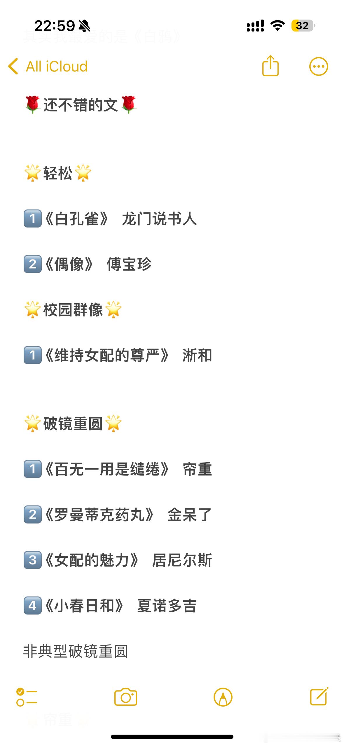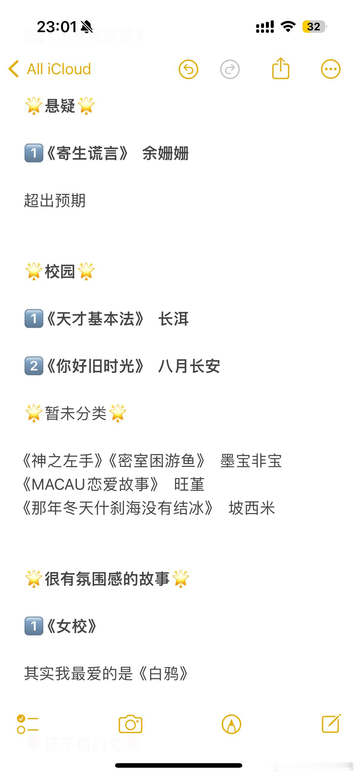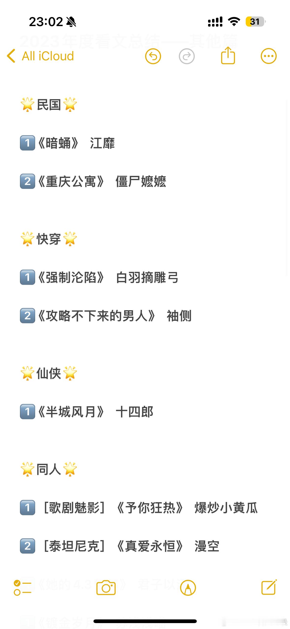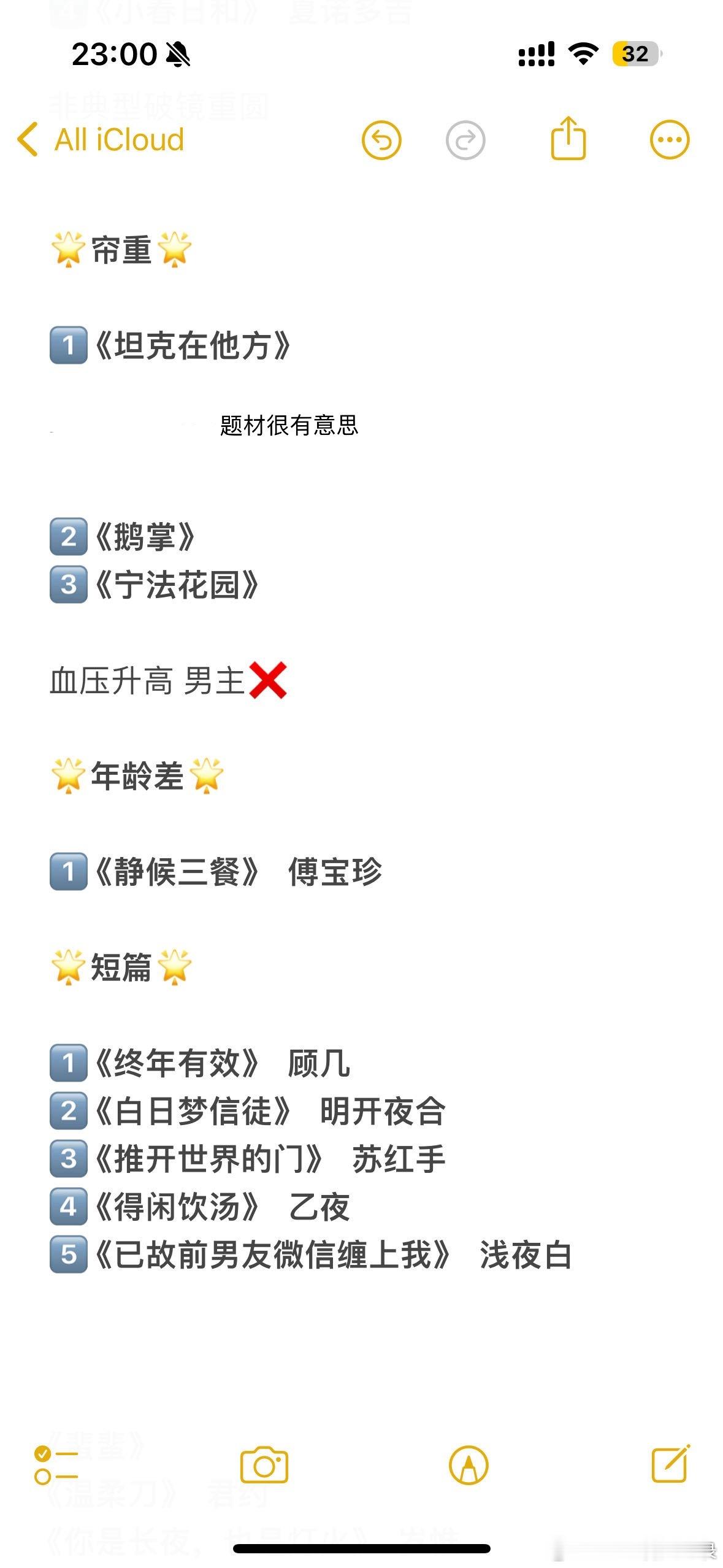 推文古言篇 ⬇️ (现言和其他类型见图)🌟历史向🌟1️⃣ 《大唐明月》 蓝云舒2️⃣ 《长安不见月》 青衣呀3️⃣ 《郁金堂》 青衣呀🌟相爱相杀🌟1️⃣ 《七星彩》 明月珰2️⃣ 《门阀之上》 诗槊3️⃣ 《春将阑》 清欢慢 (be)🌟强强🌟1️⃣ 《三十六陂春水》 衣冉2️⃣ 《清沅》 崔罗什🌟穿越🌟1️⃣ 《清穿日常》 多木木多🌟武侠🌟1️⃣ 《刺客》 沈雁2️⃣ 《风华》 苏未寒3️⃣ 《携刀照雪》 不见白驹4️⃣ 《镜明花作》 Twentine5️⃣ 《有翡》 priest🌟轻松🌟1️⃣ 《汉有游女》 蓝江陈2️⃣ 《他从雪中来》 过期白开水🌟宫廷侯爵🌟1️⃣ 《一念三千》 沉筱之2️⃣ 《太子妃花事记》 玉葫芦🌟大长篇🌟1️⃣ 《慕南枝》 吱吱2️⃣ 《世婚》 意千重🌟探案🌟1️⃣ 《簪中录》 侧侧轻寒🌟话本风🌟1️⃣ 《兰香缘》 今年小说TOP推荐