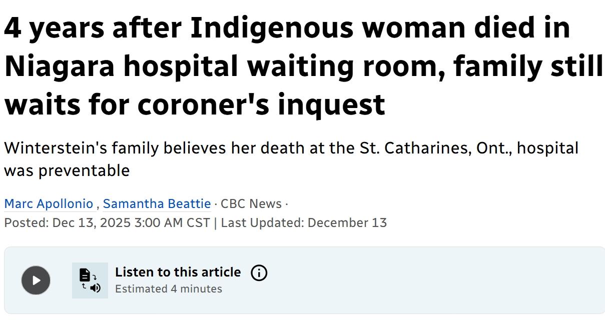 加拿大女子在医院急诊室等待中死亡,4年后仍无尸检结果 在一名24岁的原住民女性在安大略省圣凯瑟琳斯医院去世四年后,她的家人仍在等待验尸官的调查,以查明为何她未获得更多医疗护理。 2021年12月9日,加拿大安大略省24岁的原住民女性希瑟·温特斯坦于因严重背痛被送往马罗塔家庭医院(前称圣凯瑟琳综合医院),然而医生未经检查让她回家服用泰诺,病情未见好转第二天又回到医院,,在候诊区等待几小时后,病发死亡。死后被发现原因是链球菌A型血液感染。 在希瑟·温特斯坦去世四年后,如今她的家人仍在等待验尸官的调查,以查明为何她未获得更多医疗护理。 他们认为温特斯坦未能在医院接受适当的医疗评估或护理,原因是系统性种族主义和偏见——这些问题将在验尸官调查中探讨,可能促使改变,帮助其他原住民患者。 加拿大验尸官的验尸调查通常在死者去世多年后进行,根据安大略省官网,验尸调查没有时间限制。 去年,司法部宣布将举行验尸调查,以“审查”温特斯坦死亡的情况,并给予陪审团提出建议的机会。 司法部发言人斯蒂芬妮·里亚本周证实,温特斯坦的验尸听证会尚未确定日期或地点。 她说,准备验尸听证所需的时间因案件复杂程度而异,自2016年以来,省内一直面临需要强制验尸的死亡人数增加。