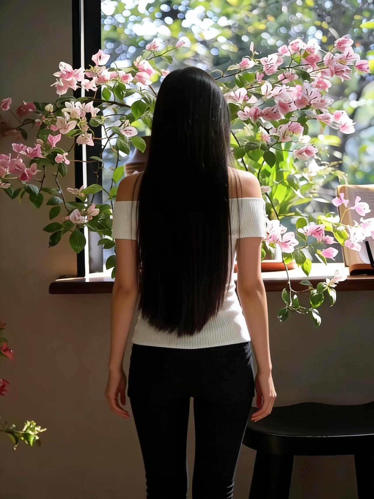 花枝越过窗,开到她身旁 粉的瓣,绿的叶,揉成温柔的浪 她背身而立,长发垂落如江 把喧嚣都隔在,这扇窗的另一方 ~ 白衫露肩,是不经意的敞亮 黑裤利落,藏了生活的晴朗 发丝的黑,与花的粉相撞 成了视觉里,最惊艳的交响 ~ 空气里飘着花的甜香 时光在这里,放慢了匆忙 她像一尊安静的雕像 与花相伴,丝毫也不慌张 ~ 不必回头,不必张望 此刻的静,就是最好的模样 长发里藏着的温柔与坦荡 被花枝,轻轻点亮 ~ 岁月的风,吹过窗棂与发梢 花会谢,而这份美好 却在镜头里,永远定格住了 成了心底,最柔软的符号