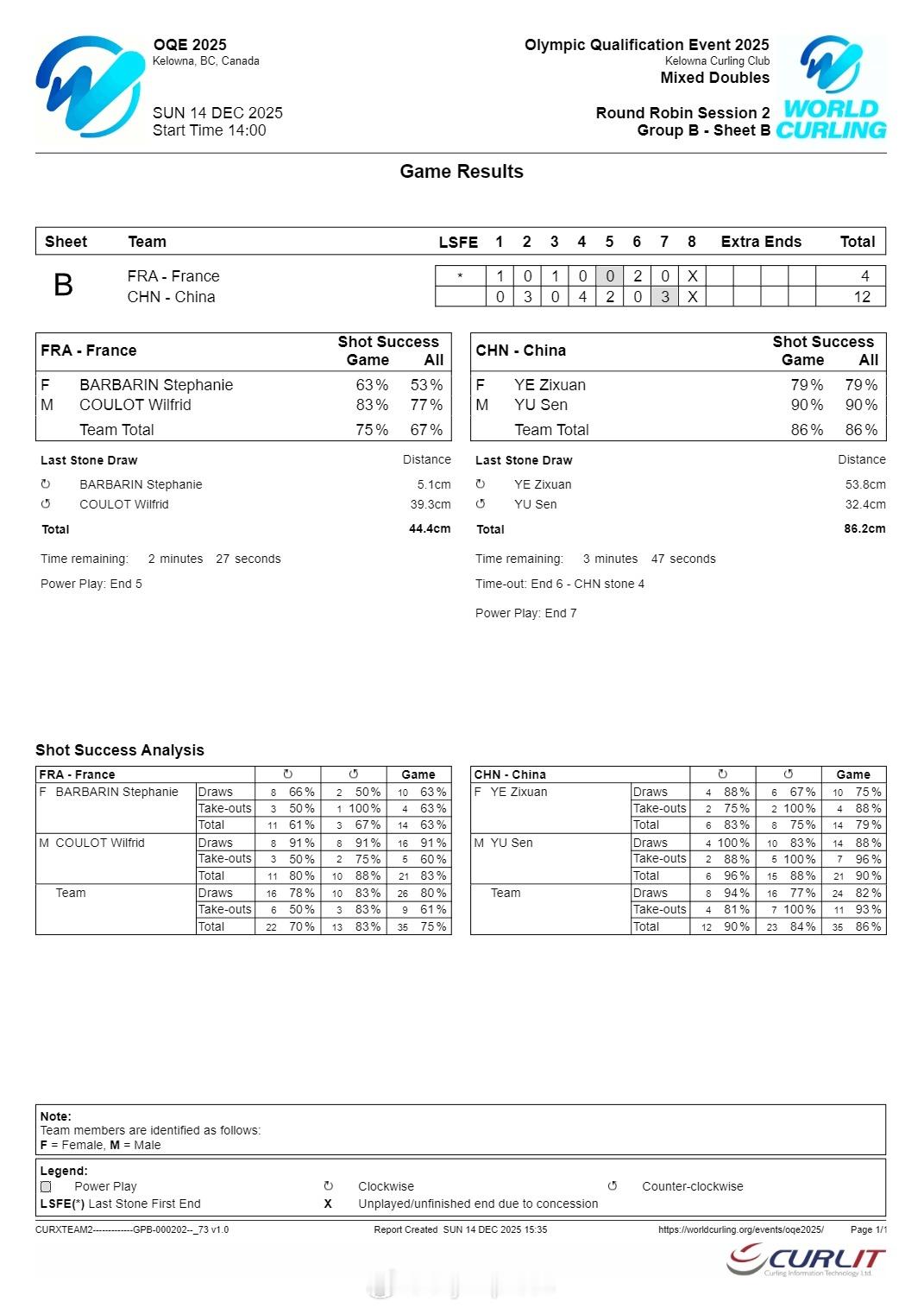 【冰壶冬奥落选赛中国混双12-4大胜法国 取得两连胜】国际体坛战报速递 12月14日加拿大基洛纳,冬奥冰壶混双落选赛,中国队第二场12-4大胜法国,取得两连胜。北京时间16日凌晨2时,中国队将迎战同为两连胜的荷兰。
