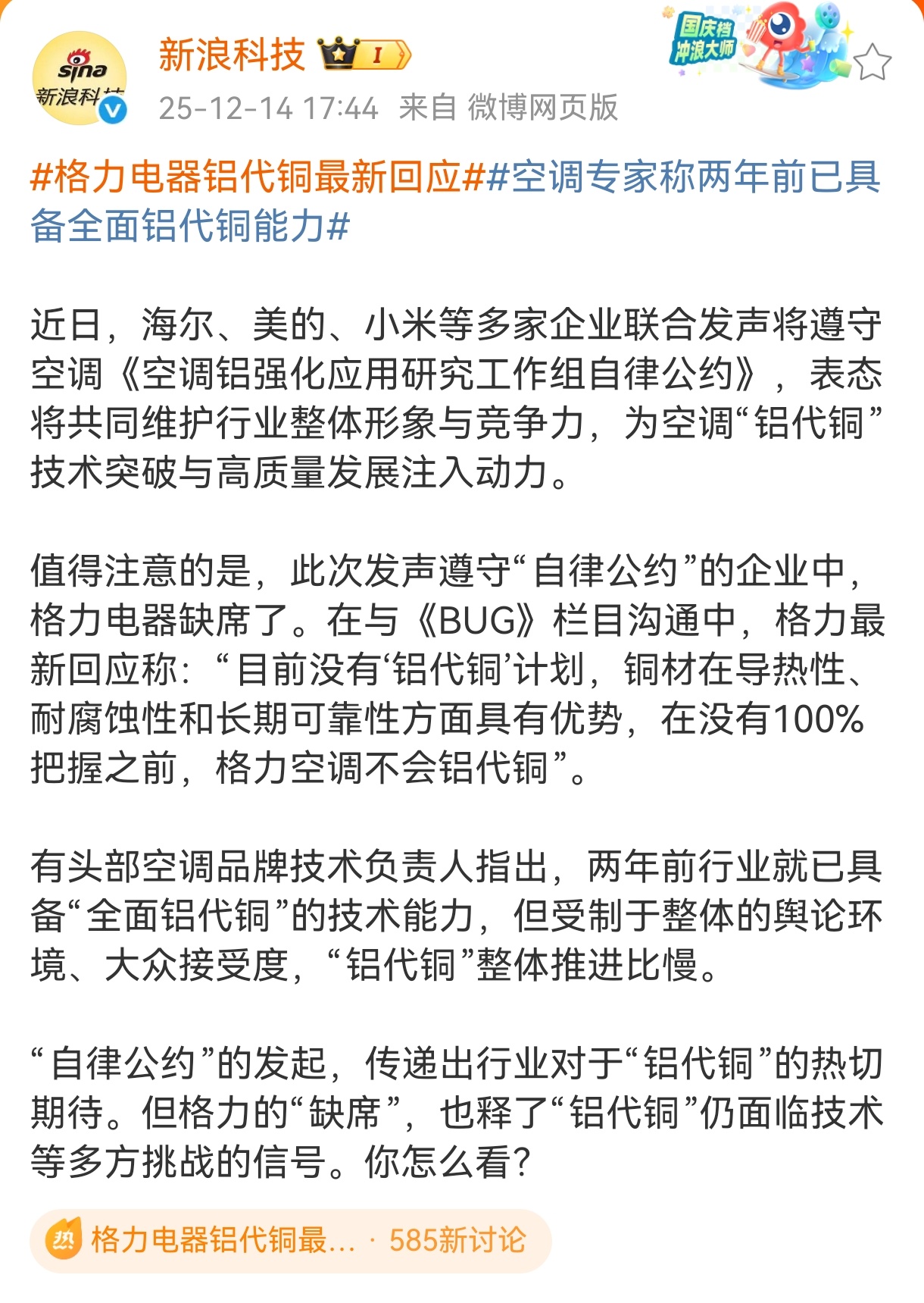 格力电器铝代铜最新回应空调专家称两年前已具备全面铝代铜能力近日,海尔、美的、小米等多家企业联合发声将遵守空调《空调铝强化应用研究工作组自律公约》,表态将共同维护行业整体形象与竞争力,为空调“铝代铜”技术突破与高质量发展注入动力。 广州