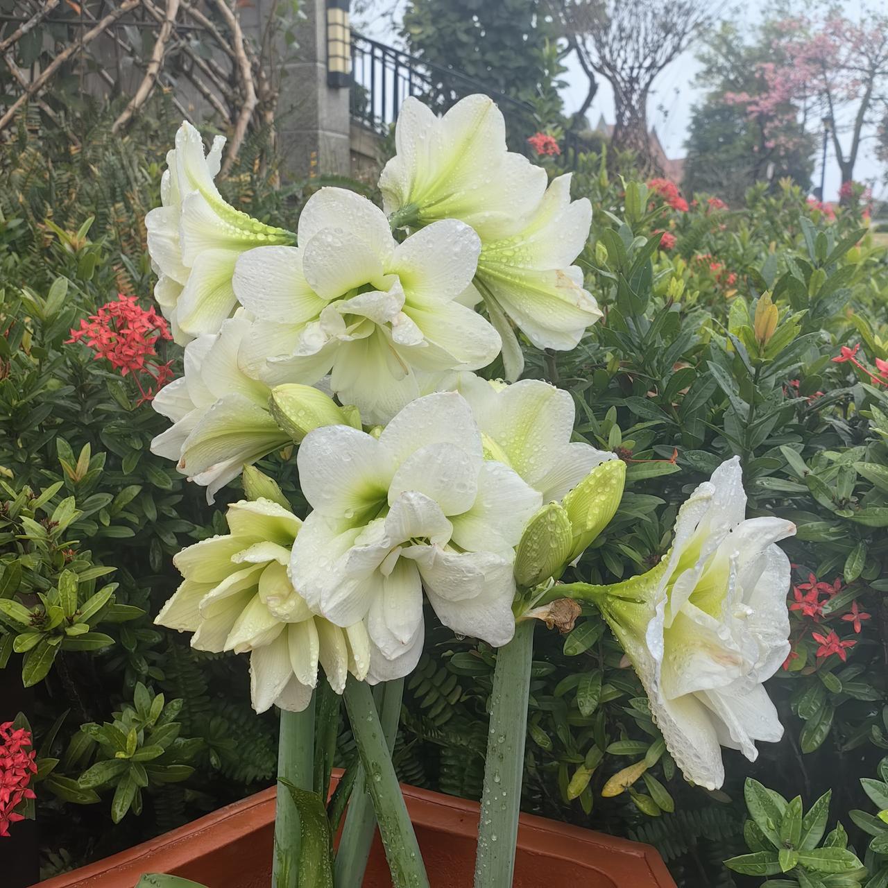 不是常见的艳红或粉紫,而是极清透的白。层层叠叠的花瓣舒展着,边缘泛着浅浅的绿晕,像被春日的晨露浸过般温润。花瓣上还挂着未干的水珠,风一吹,水珠轻轻滚动,又稳稳停住,给素白的花添了几分灵动。 花茎笔直地立着,衬得整株花既挺拔又温柔,在周围红绿相间的绿植映衬下,像一方被精心擦拭过的玉,干净得晃眼。 等走远了,还忍不住回头望了一眼。真的好漂亮。