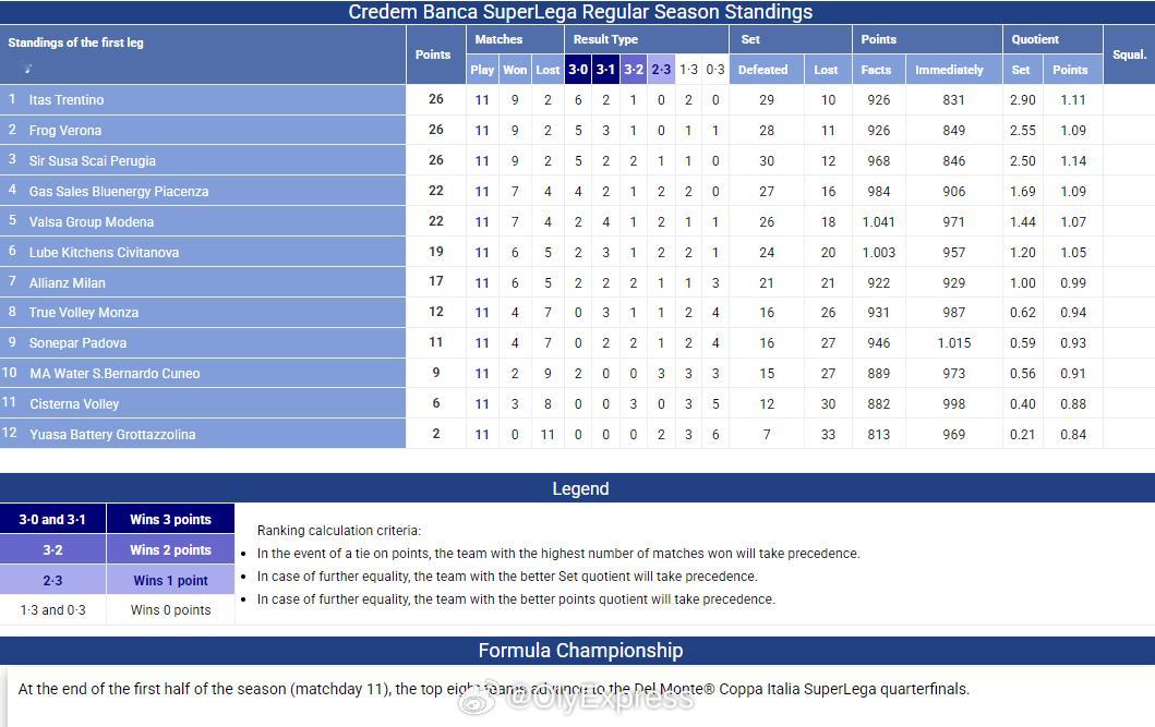 【男排意大利杯八强对阵】国际排坛动态 12月14日,意超男排常规赛上半程最后一轮结束,参加意大利杯的八支队伍全部产生,对阵如下:上半区:特伦蒂诺vs蒙扎皮亚琴察vs摩德纳下半区:佩鲁贾vs奇维塔诺瓦米兰vs维罗纳
