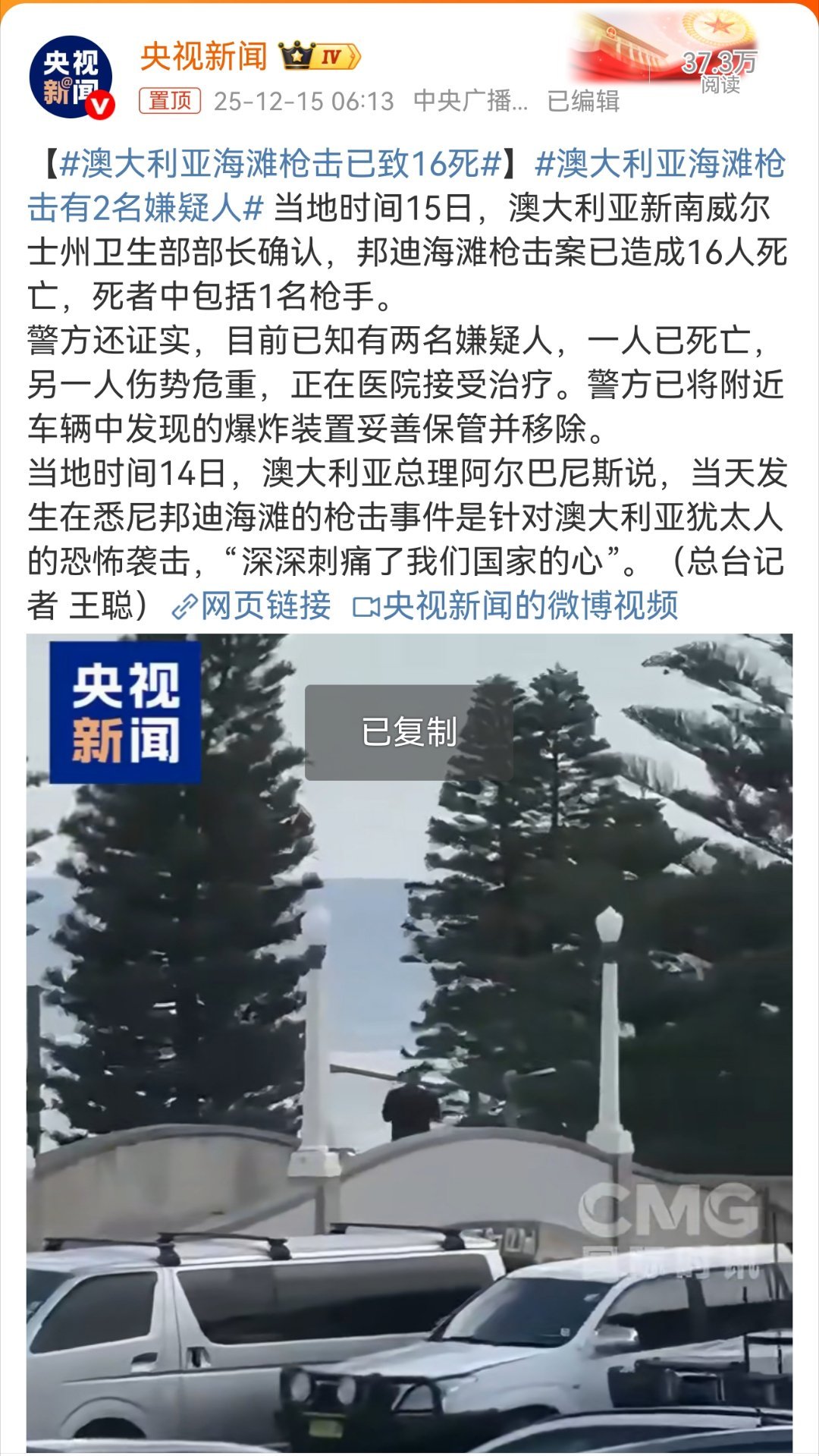 海滩血案,侵略种下的仇恨苦果悉尼邦迪海滩16人殒命的枪声,是巴以冲突外溢的血色注脚,更是以色列长期施暴引发的仇恨反噬。当以色列以“自卫”为名,在加沙实施无差别轰炸,将巴勒斯坦人逼入生存绝境——儿童葬身废墟、医院沦为靶场、人道主义通道形同虚设,这种赤裸裸的侵略与屠杀,早已突破人类良知底线。世界对以色列的反感并非凭空而生,而是对强权霸凌的集体愤怒。反犹情绪的抬头,本质是对以色列犹太人暴行的迁怒与反抗。以色列若持续沉迷武力扩张,无视国际正义与巴勒斯坦人民的生存权,只会在全球范围内点燃更多仇恨火种,让暴力循环愈演愈烈。血的教训警示:侵略从来没有赢家,唯有停止屠杀、回归谈判,才能终结这场人道主义灾难。澳大利亚海滩枪击已致16死