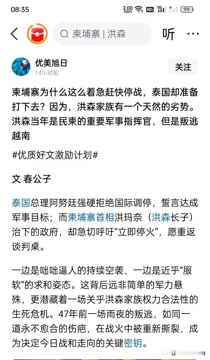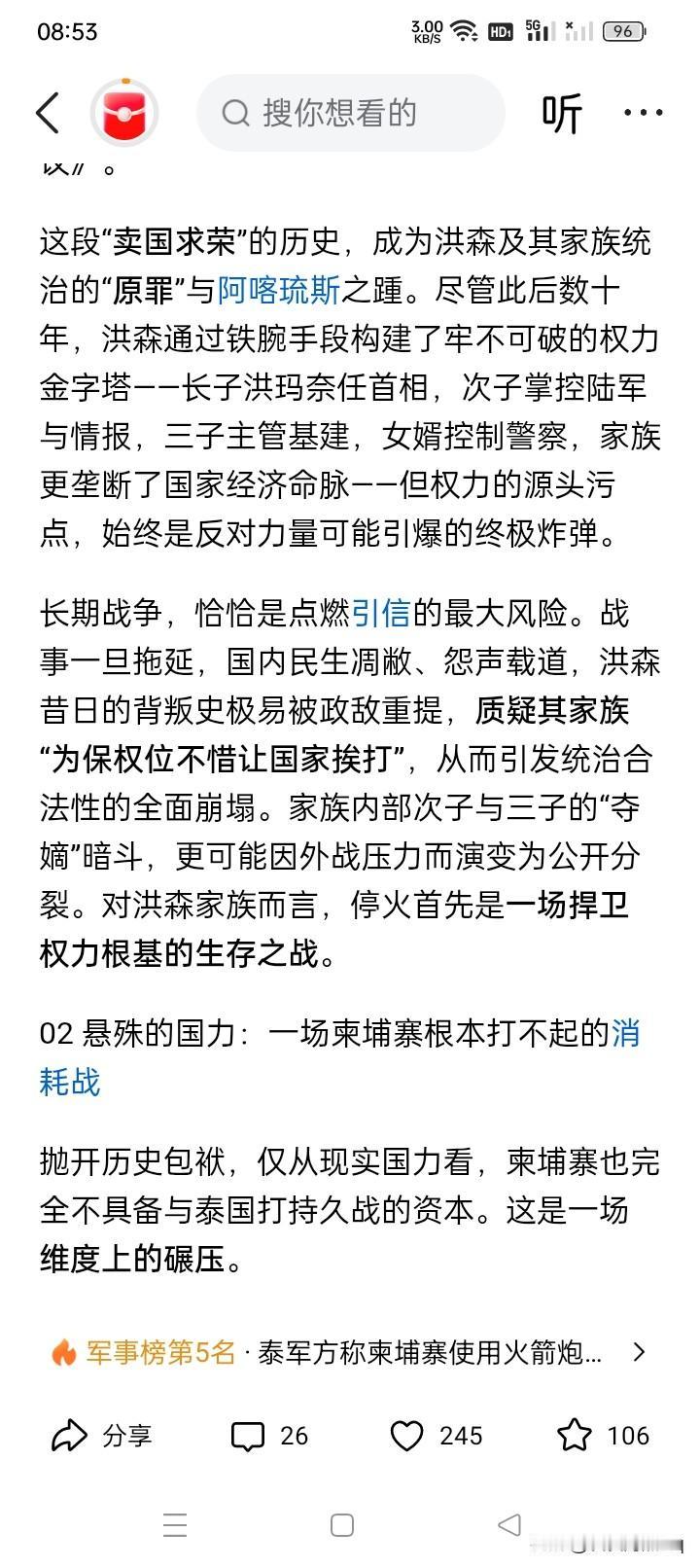 什么原罪?家族! 网络上有消息说,泰国与柬埔寨发生的军事冲突,目前柬埔寨迫不及待的似乎原意停火,重返谈判桌。而泰国的态度恰恰相反,似乎又愿意打下去。 柬埔寨不愿意打下去的原因主要有什么,有人认为,主要是当初洪森从民主柬埔寨叛逃越南的“原罪”等等。这种看法,好像有点道理,实际上却很可能远不是那么回事,不由得令人疑窦丛生,迷惑不解。 柬埔寨就是一个地地道道,彻头彻尾的家族统治的国家,洪森表面上退出领导权之后,他的大儿子洪玛奈任政府首相,二儿子掌握国家陆军和情报,三儿子掌管国家的基建,女婿掌握国家的警察。这种家族权力架构的国家体系,表面上看权力严格集中在洪森家族,坚固稳定,无懈可击。其实,当他们都是以家族利益为首要目标的时候,必然必然严重损害国家利益,好像更谈不上使用合理合法手段治国,内部管理和军队的战斗力很可能一团糟,在强敌面前根本就不是对手。 以后,甚至是还有极大的可能,为了家族利益而不惜出卖国家利益。