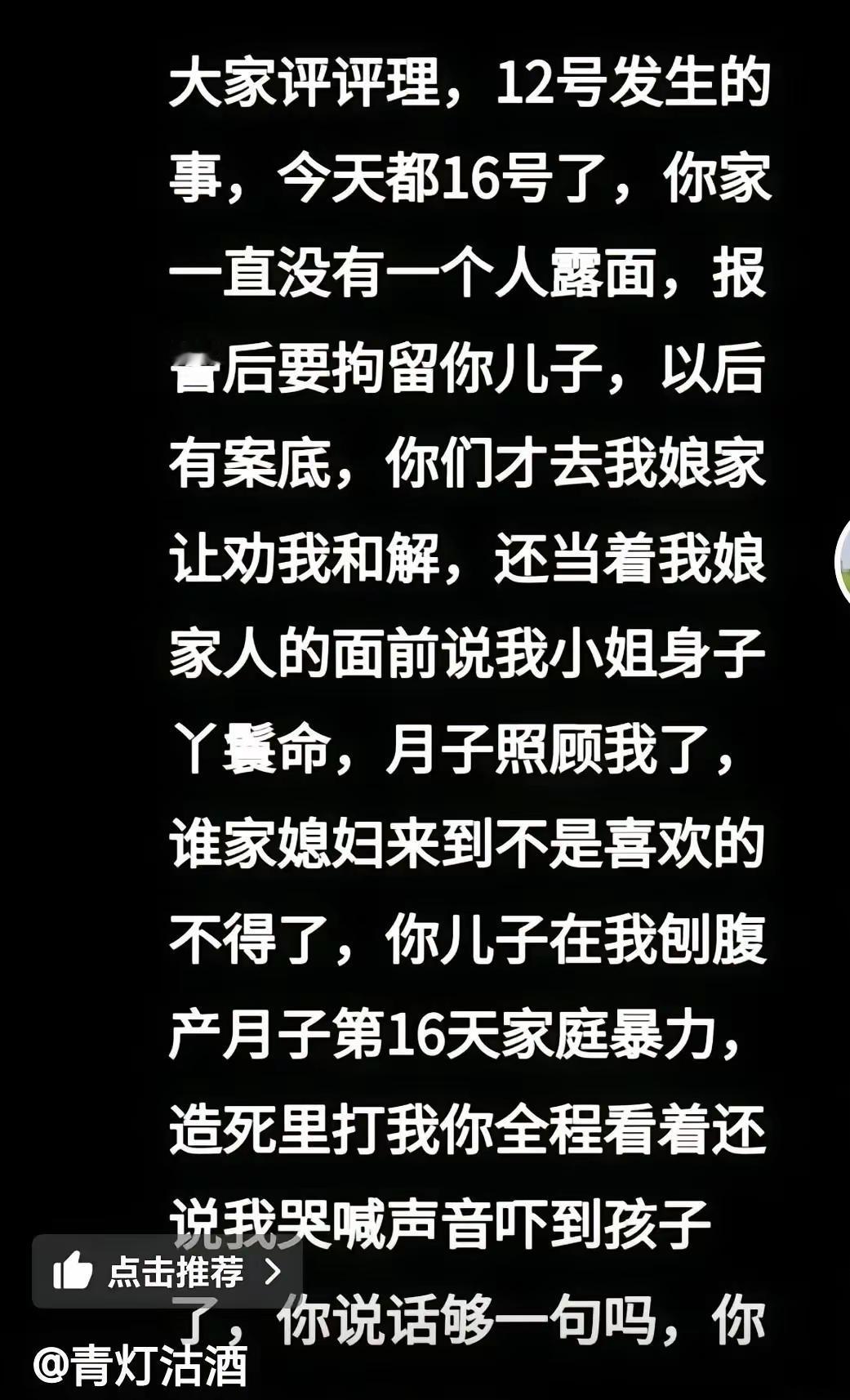 这个女子还算清醒,没有因为孩子把自己陷在万劫不复中。月子第16天,因为孩子总哭闹,男人嫌吵,骂女子还不解恨,居然打上了,打头踹肚子,剖腹产才半个月,刀口还没长好,又被踹破,满床满身的血惨不忍睹,男人也不管,婆婆全程冷眼旁观,还嫌女子哭喊声大吓到了孩子,真是应了那句“无妻全家急,有妻全家欺”。后来女子报警,知道会留案底才出面求和,说是求和,却没有一句好话,当娘家人面嘲讽女子小姐身子丫鬟命,这娘俩恶心透了,现在女子不想和这家人有任何瓜葛,宁愿什么也不要,也要离开这豺狼虎穴。。。 及时止损是对的,月子里就往死里打,不敢想以后怎么过,远离渣男恶婆,不要对这种人心慈手软,人生路还长,过好往后的生活。