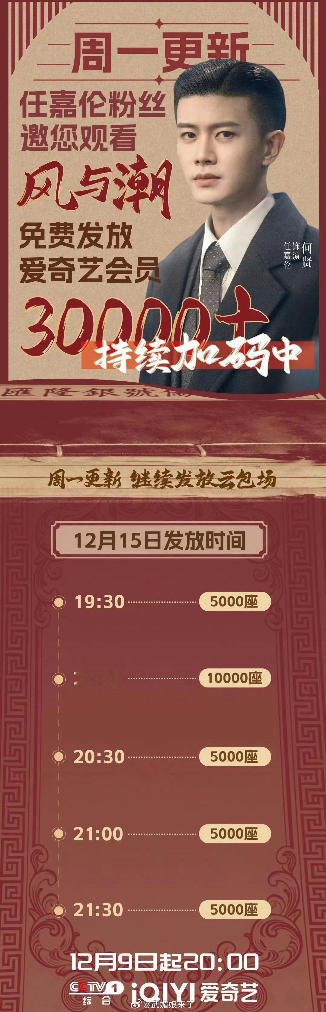 《风与潮》今日复更,任嘉伦粉丝又准备了3万➕座云包场请大家看剧,这部剧是真的值得追👍