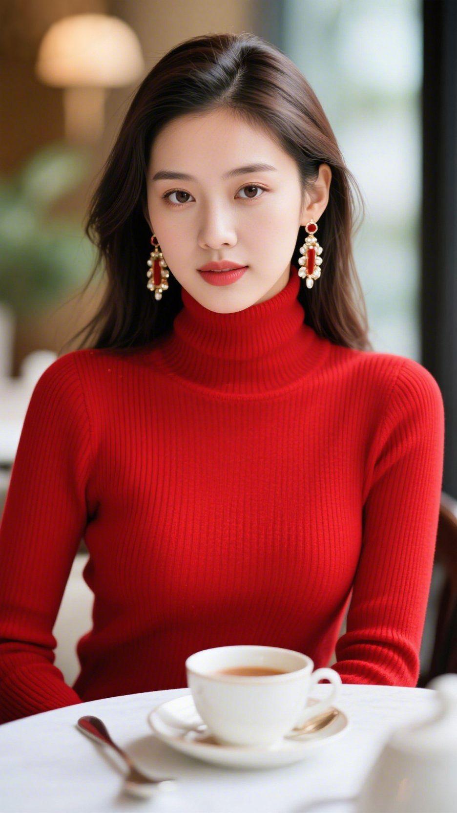 《红衫映暖午后光》 午后的柔纱漫过窗沿,落在她身上那袭正红高领衫时,绒线织纹里浸满了温煦——像把冬阳揉进衣料,连周遭的空气都软了几分。耳畔耳饰缀着红珠与珍珠的柔光,衬得眉眼间的舒展愈发妥帖。 白瓷茶杯的雾霭轻晃,她静坐在桌前,气息里裹着松弛的暖意:是桌布垂落的软边,是灯光晕开的浅黄,也是抬眼时,眼底漫开的、不慌不忙的温和。 原来日常的舒展,从不是刻意的修饰,是把暖意浸在时光里,让每一刻都从容又生动。 冬日温柔穿搭 午后松弛时刻