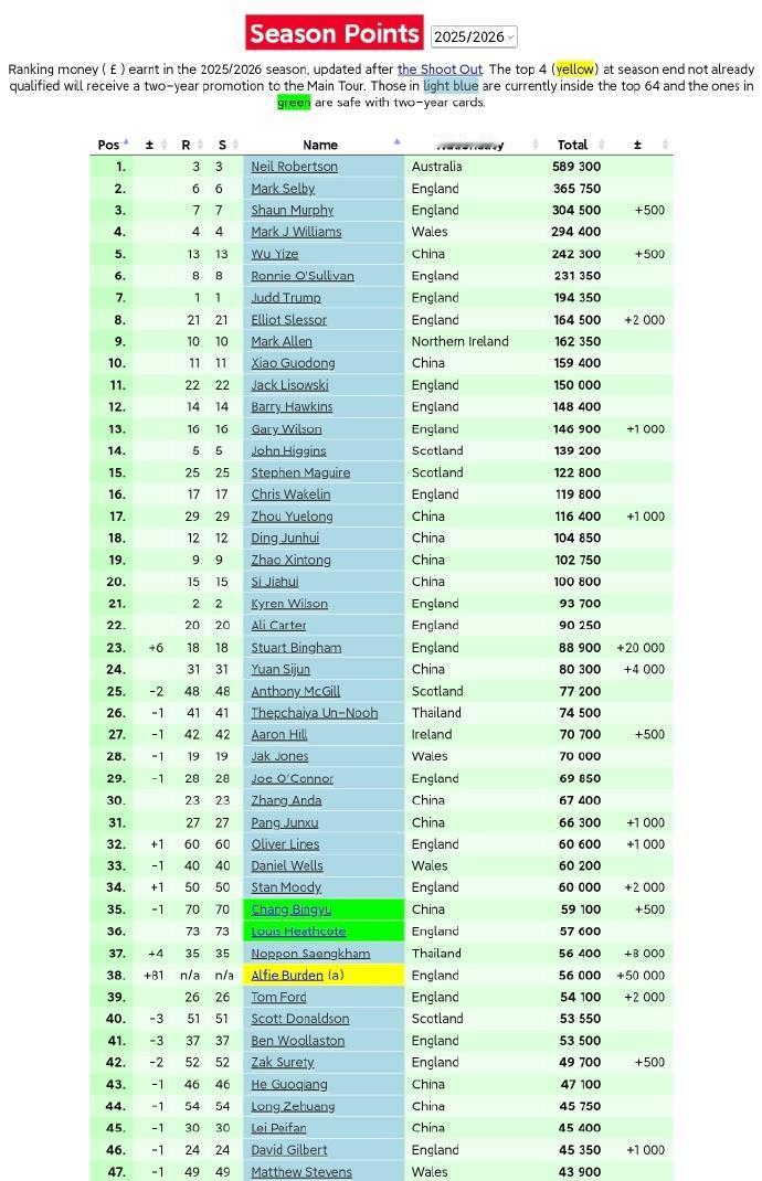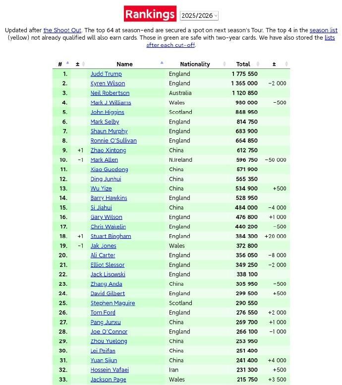 斯诺克:2025单局限时赛赛后最新世界排名+单赛季排名 世界排名: 因为单局赛奖金很低,加上顶级选手参赛寥寥,排名上几乎没有变化:艾伦扣掉同期冠军奖金,跌到第10,赵心童升到第9。亚军宾汉姆升到第18位。不过前16基础线和第17位的差距仍然很大,短时间内前16排名很难发生变化。 单赛季排名: 单局限时赛亚军宾汉姆拿到2万英镑,上升到赛季第23位,几乎确保大奖赛席位。冠军伯顿拿到5万英镑,上升到第38位,有望凭借单赛季排名重返职业。