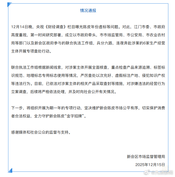 【#官方通报陈皮年份虚标#】江门市新会区市场监督管理局通报:12月14日晚,央视《财经调查》栏目曝光陈皮年份虚标等问题。对此,江门市委、市政府高度重视,第一时间研究部署,成立以市政府牵头,市市场监管局、市公安局、市农业农村局等部门以及新会区政府参与的联合执法工作组,兵分六路,连夜奔赴涉案的6家生产经营主体开展专项查处行动。联合执法工作组根据新闻线索,对涉案主体开展全面核查,重点检查产品来源追溯、标签标识规范、地理标志专用标志使用等情况,严厉查处以次充好、虚假标注产地、侵犯知识产权等违法行为。目前,已依法对涉案主体的相关产品采取查封等措施,对涉嫌违法的经营行为立案调查,后续将严格依法处理,并及时向社会公开有关情况。下一步,将组织开展为期一年的专项行动,坚决维护新会陈皮市场公平有序,切实保护消费者合法权益,全力守护新会陈皮“金字招牌”。感谢媒体和社会公众的监督与支持。