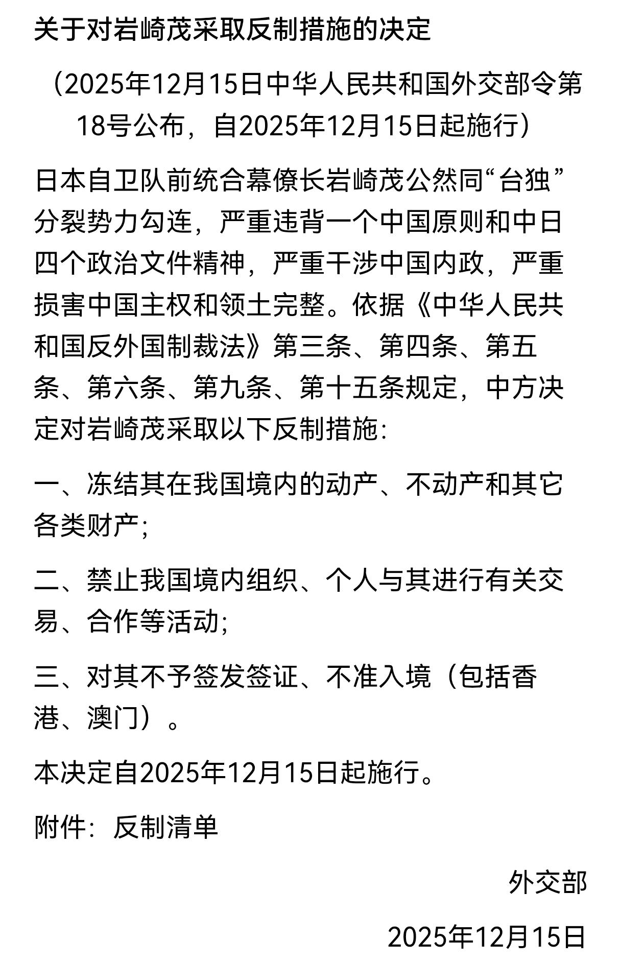 前所未有,中国对日本军方官员岩崎茂进行制裁,这事儿大快人心! 岩崎茂公然和“台独”分裂势力勾连,严重违背一个中国原则,干涉我国内政、损害我国主权和领土完整,简直是自讨苦吃。 中方依据《中华人民共和国反外国制裁法》,对他采取了冻结财产、禁止交易合作、不予签证和不准入境等反制措施。这清晰表明,中国维护国家主权和领土完整的决心坚定不移,任何试图挑战这一底线的人都将受到应有的惩罚。岩崎茂此举是对中日关系的严重破坏,必须付出代价。 你认为日本应如何为侵华历史道歉