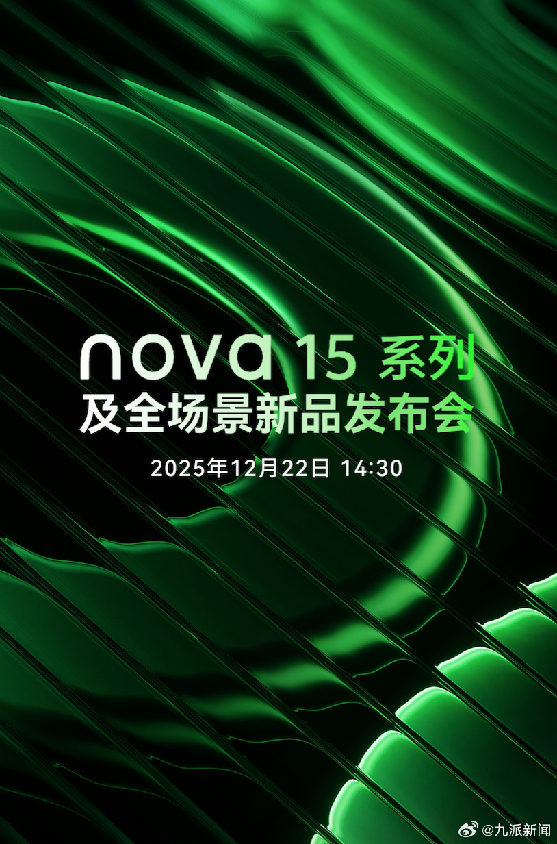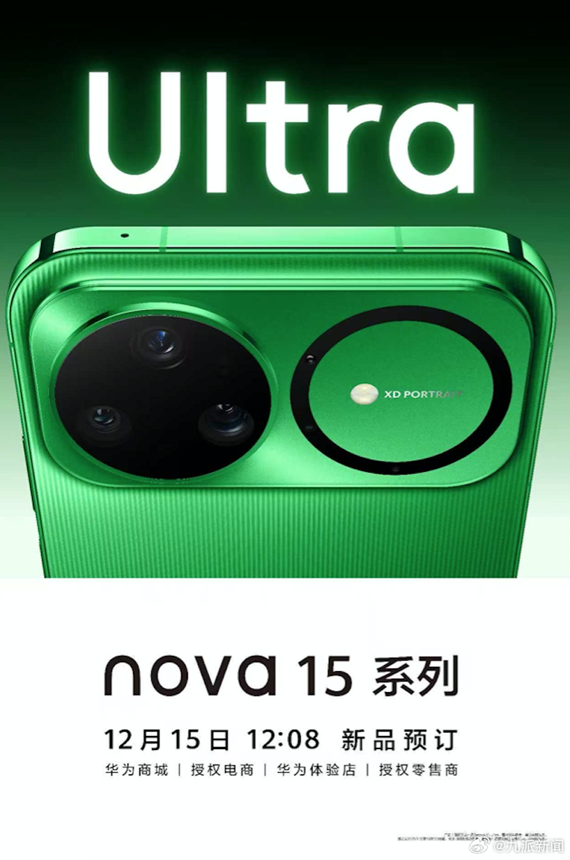 12月15日,华为官方陆续发布最新的nova 15系列系列海报。其中最先亮相的主打色为高饱和度绿色,十分吸睛,镜头模组由历代竖向设计改为横向立体双圆设计,独特造型强化了#华为nova15外观曝光#。从品牌标识的细节变化来看,有网友猜测星耀标或将迎来焕新升级,以此强化品牌辨识度,据了解,nova 15系列全系将于12月15日12:08正式开启预订,可通过线上线下渠道进行预约。#华为nova15全系开启预订#
