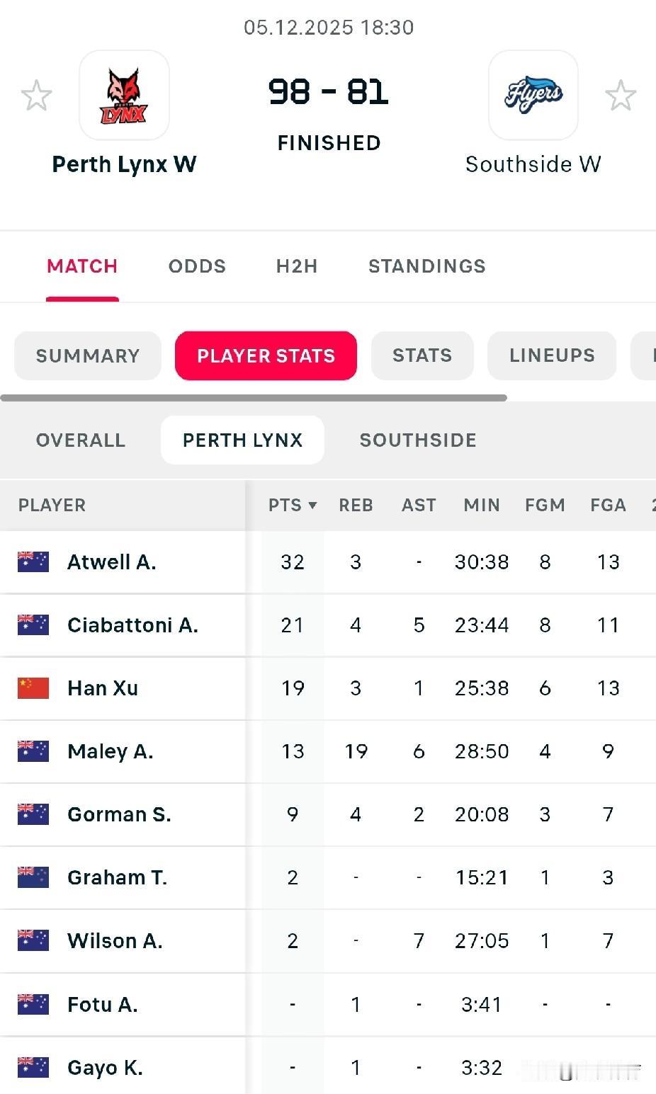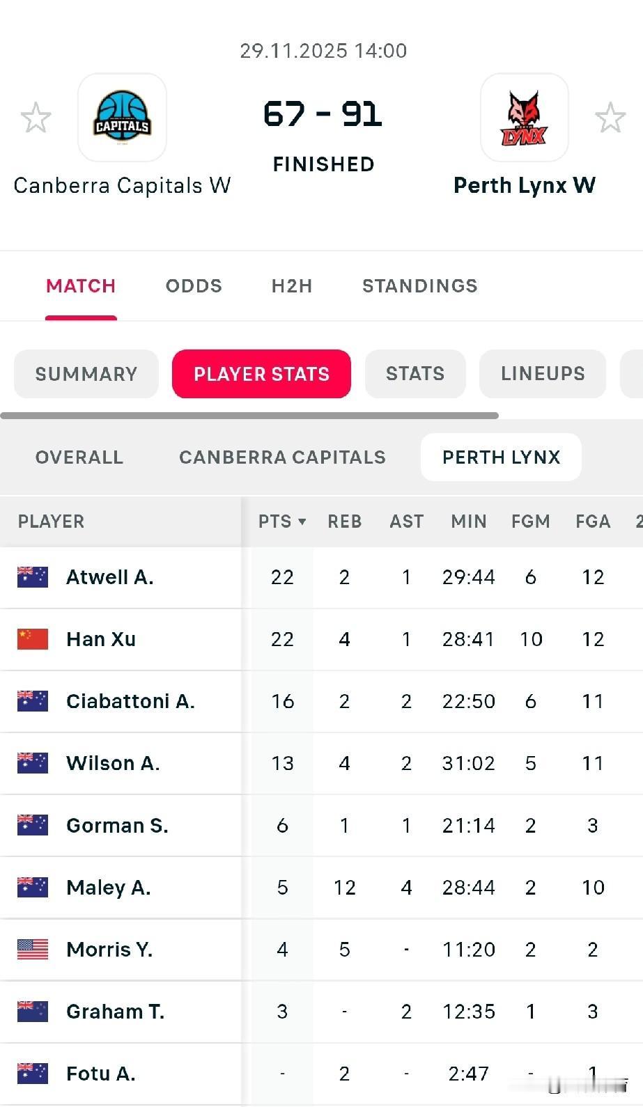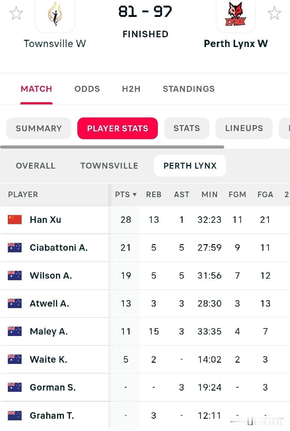 澳洲女篮联赛最近三场比赛技术统计: 11月29日,22分4板1助攻,28分钟 12月5日, 19分3板1助攻,25分钟 12月14日,28分13板1助攻,32分钟 球队排名:8胜3负,排名第三。
