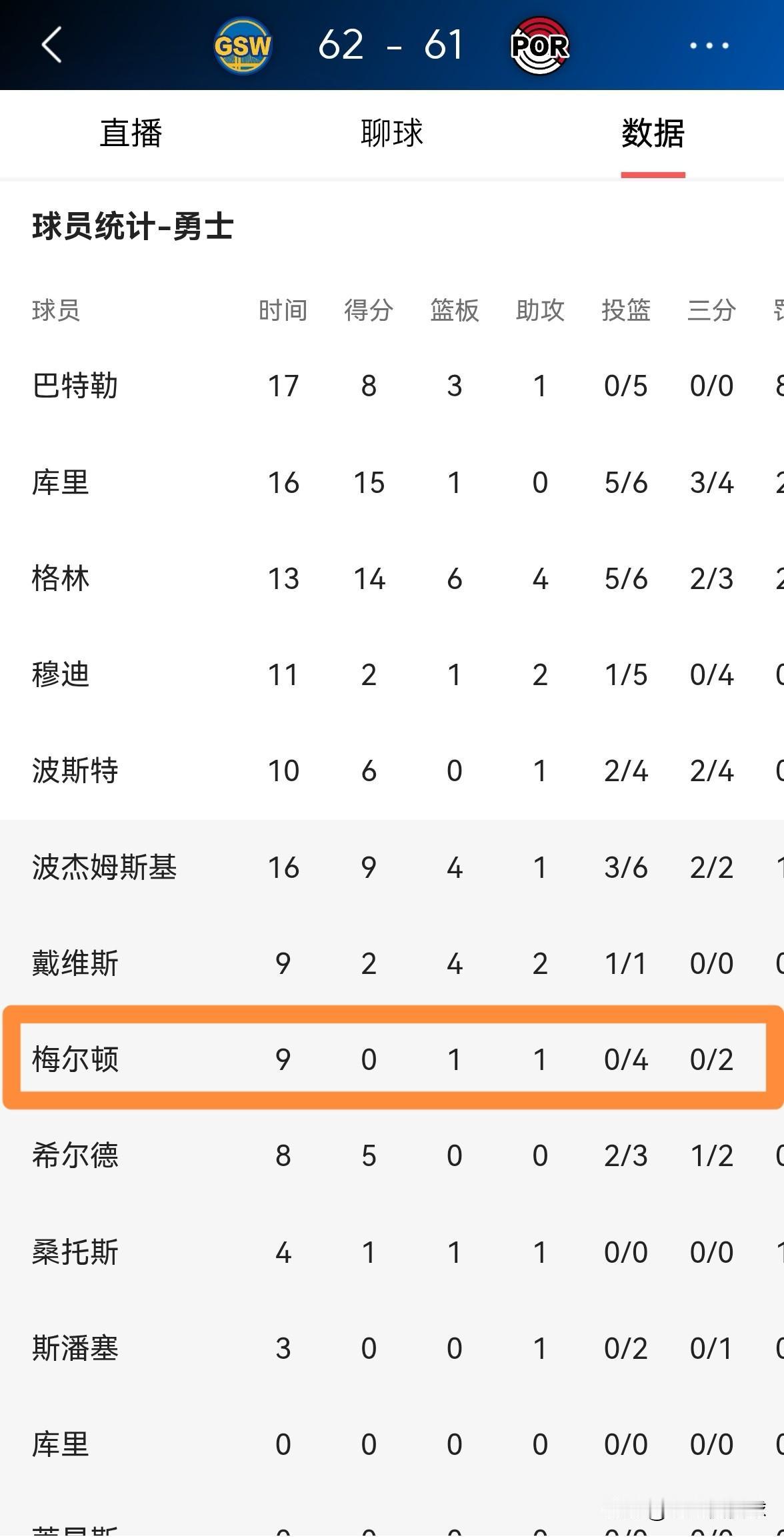 勇士大将梅尔顿真是太拉胯了!在今天进行的勇士和开拓者的比赛中,目前双方的上半场比赛已经结束,勇士以62:61领先对手。让人感到异常失望的是,在前两节比赛中,梅尔顿替补出战9分钟,投篮4中0,其中三分球2中0怒砍0分。 作为勇士替补阵容的核心球员之一,梅尔顿打出如此低迷的表现真是太让人失望了,他必须在下半场比赛中提升自己的表现才行。