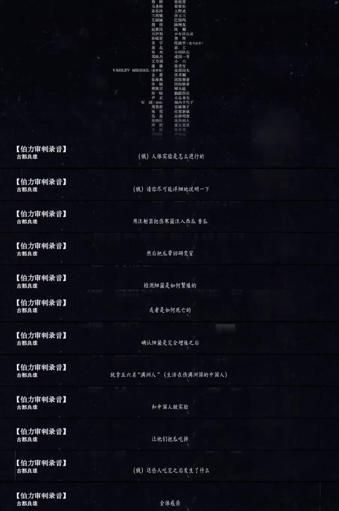 差一点就错过这么重要的片尾 追《反人类暴行》到结局,差点忽略片尾。没想到黑暗中响起伯力审判原声,战犯麻木的语气讲着实验细节,没有BGM烘托,却让人胸口发紧! 反人类暴行