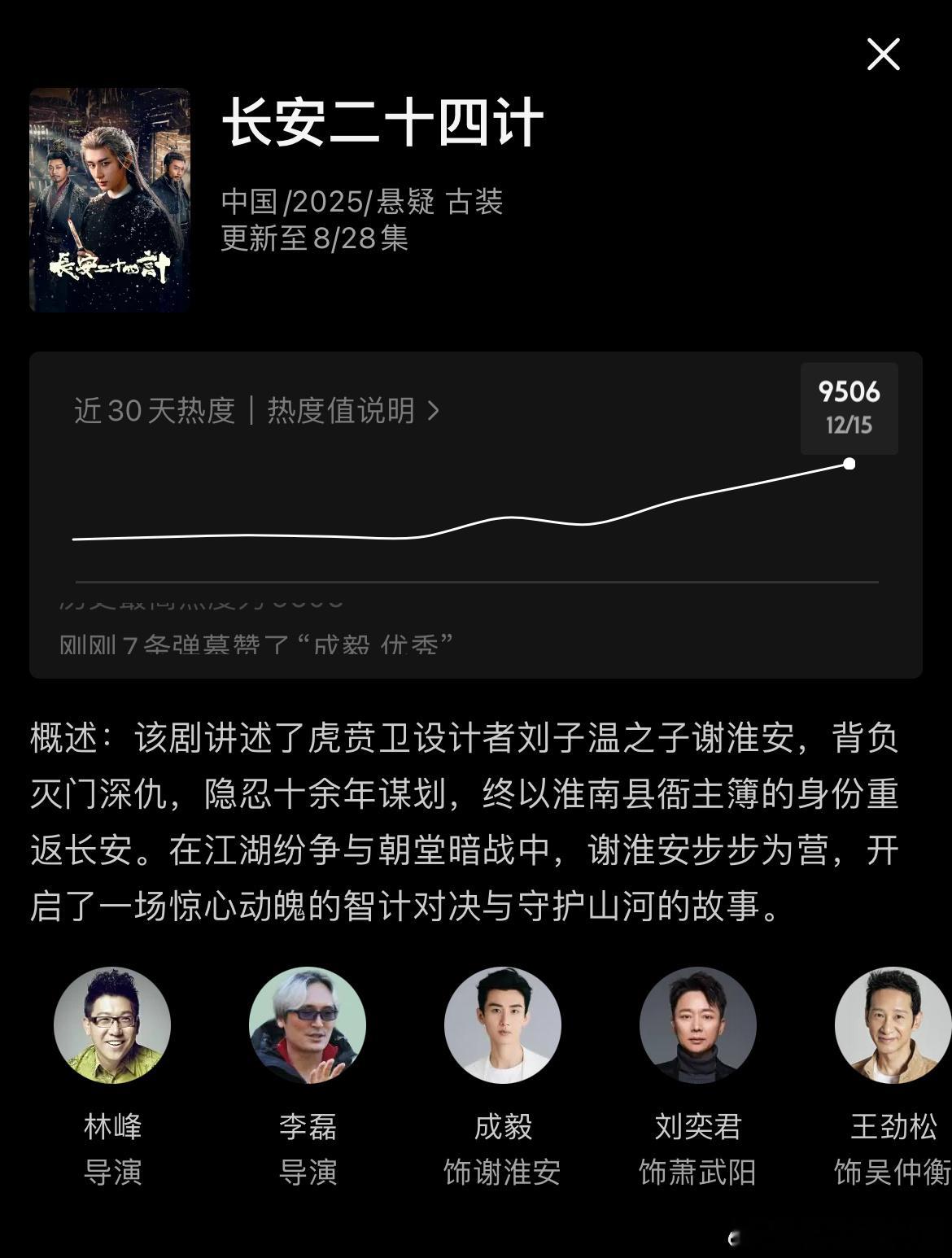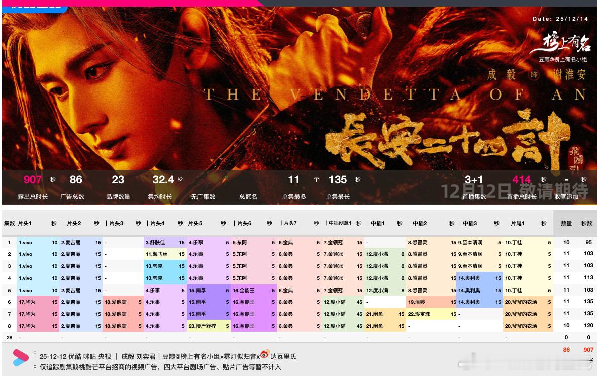 成毅长安二十四计优酷热度破9500 开播第4天破9500昨天(周日)播放量不如第二日招商保持挺好,总时长907s了