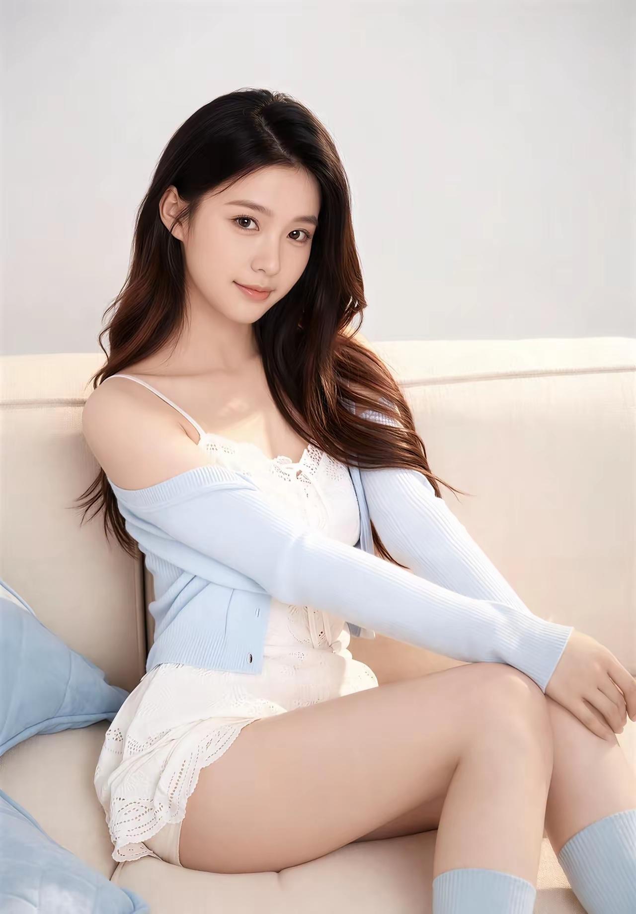 温柔甜美的少女,坐在沙发上,穿着浅蓝色毛衣和白色蕾丝裙,散发着青春的气息。