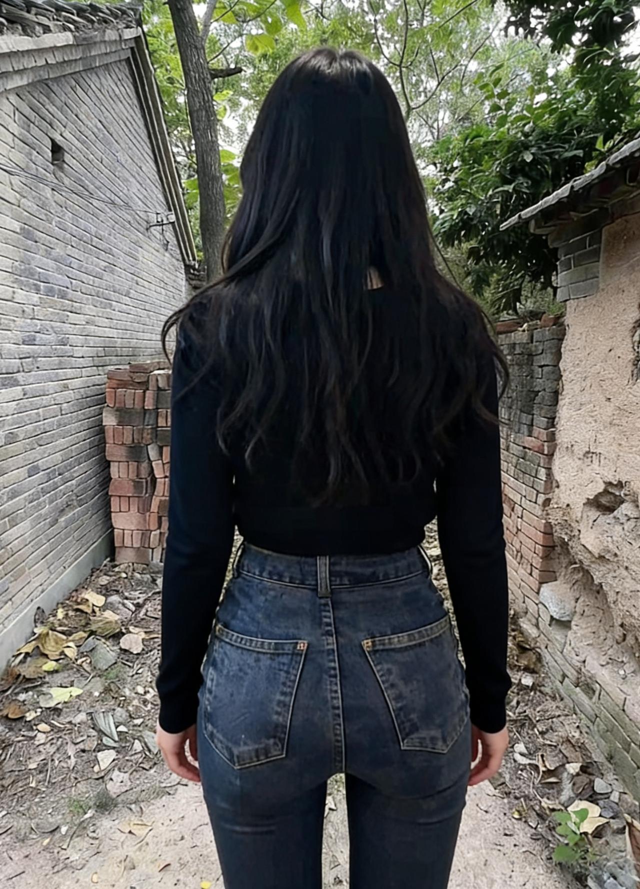黑衫长发立巷中,砖壁苔青拂金风。 不语背影凝远色,落叶纷飞诉秋浓。