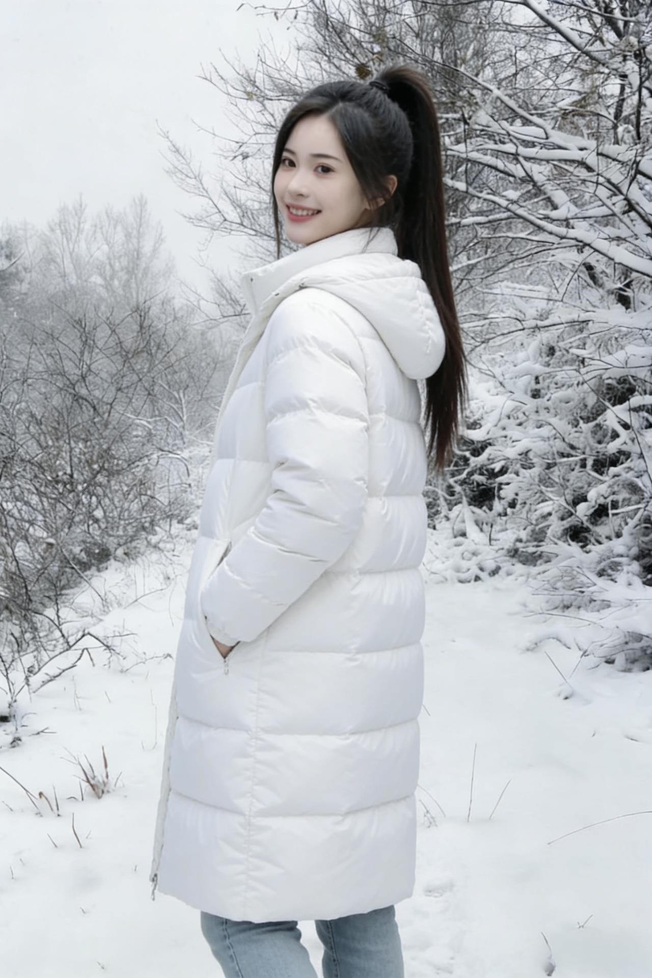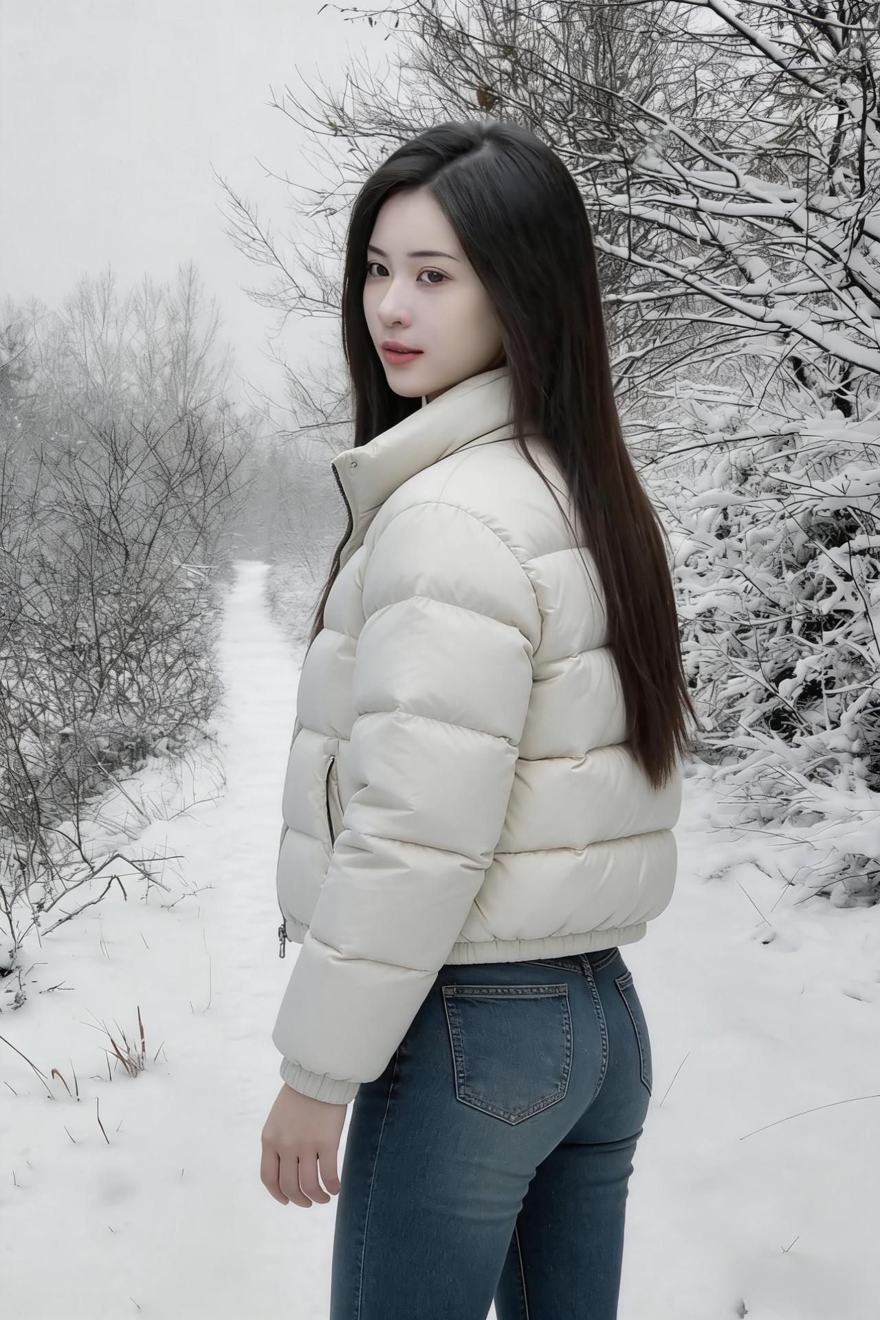 米白羽绒服裹着温柔 落在雪林的冷意里 牛仔裤的硬,撞着雪的软 像刚与柔,在冬里相遇 ~ 枯枝的枝桠,刺向灰天 她的侧影,却柔化了这尖锐 目光斜斜,与镜头对望 像在说,冬也有温柔的扉 ~ 雪落在衣上,积成薄绒 她的指尖,未触到雪的寒 米白是冬的柔光 披在她身上,暖了整片林峦 ~ 雪径的白,衣的白,融成一片 她是雪林里的序章 写着温柔,写着期盼 写着春,就在不远处的山岗