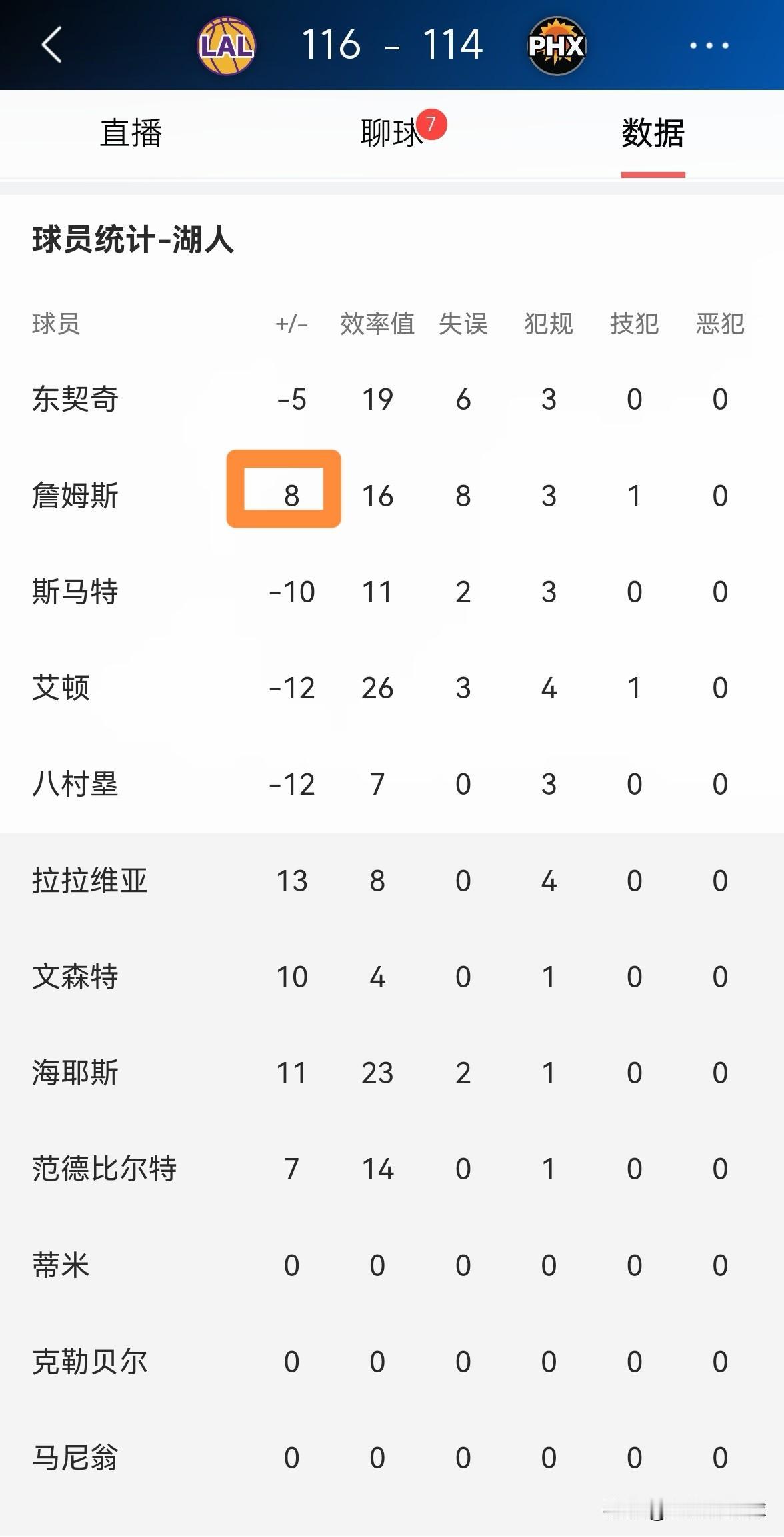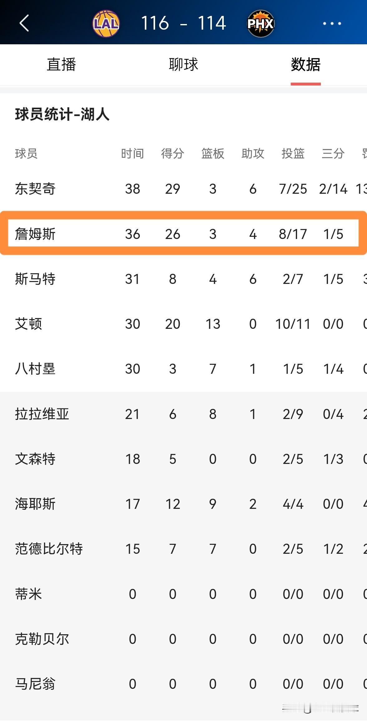 湖人老将詹姆斯永远是球队的定海神针!在今天湖人客场以116:114险胜太阳的比赛中,詹姆斯首发出战36分钟,投篮17中8,其中三分球5中1、罚球14中9得到26分3篮板4助攻2抢断2盖帽,他的场上正负值为+8,不过出现了8次失误。 值得一提的是,在比赛的最后时刻,詹姆斯在三分线外造成了布克的犯规获得了3次罚球,从而帮助球队锁定了胜局。 在我看来,只要詹姆斯不退役,他永远是湖人的定海神针,关键时刻湖人真的离不开詹姆斯。