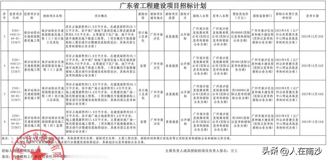 【南沙站建设继续有新进展!24.22亿建下沉广场及地下“中央城市”通廊】广州南沙投发铁路有限公司发布南沙站综合交通枢纽配套设施工程招标计划。根据公示,项目占地面积约11.8万㎡,总建筑面积约20.5万㎡。 其中南广场占地面积约5.6万㎡,地下基础设施工程总建筑面积约6.9万㎡,建设下沉广场、地下中央城市通廊及地下配套工程等;地上建筑面积约13.6万㎡,主要建设南广场一体化配套设施工程等,总发包价达24.22亿元。 而早期珠江规划勘测设计有限公司发布的《南沙站周边七涌改移工程生态景观方案》就有下沉广场和南广场的介绍。其中南广场将打造世界级高品质城市公共空间。 需要注意的是,本地的南广场仅包含广场部分,而其他的生态中轴涌等项目,应该是属于“南沙站周边七涌改移工程”。