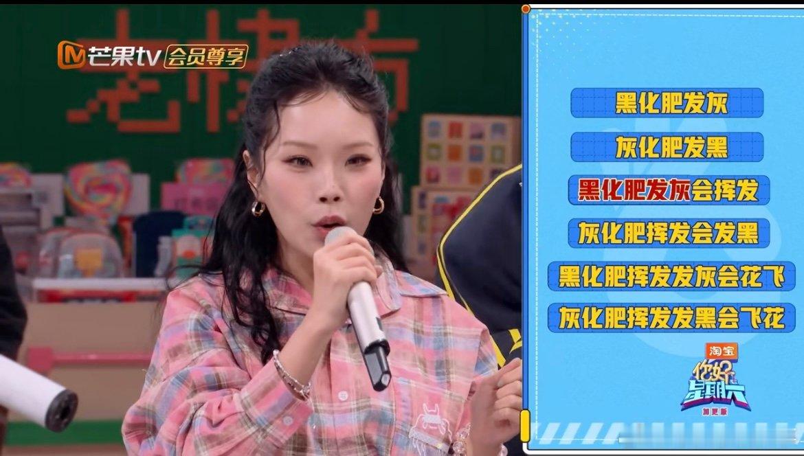 万妮达说绕口令堪比打字机 谁被万妮达的嘴速惊到了?《你好星期六》绕口令游戏中,“黑化肥会发灰” 说得又快又标准,打字机式输出全场佩服~你好星期六