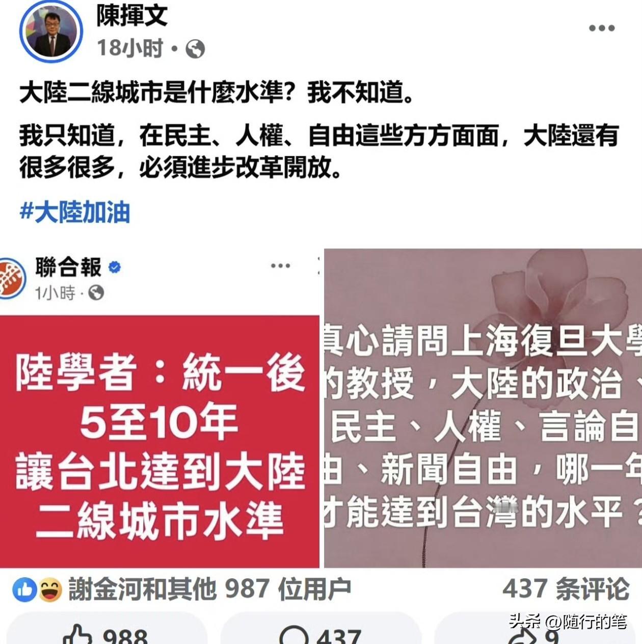 台名嘴陈挥文破防了,不过是被岛内媒体忽悠破防的。 大陆学者张维为教授说“统一之后,5到10年内可以让台北的城市基础建设提升到二线城市的水平”,但是这段话被岛内一些媒体恶意断章取义,把“基础建设”的字眼去掉,误导岛内民众,挑起岛内舆论对张维为真正意思的误解。其中台湾名嘴陈挥文就是其中一个,看到岛内媒体断章取义的报道就信以为真,马上破防发文回击,又把西方那老三样搬出来做说辞。 陈挥文作为岛内一个评论员,也算是有学识的人,没想到也这么不严谨,轻信岛内这些不安好心的媒体报道。另外,陈挥文虽然看待大陆的进步不像民进党那么糊涂,但是对西方那一套的坚持真的是已经深入骨髓了,台湾搞到这个地步都还自我感觉良好,真的令人啼笑皆非。