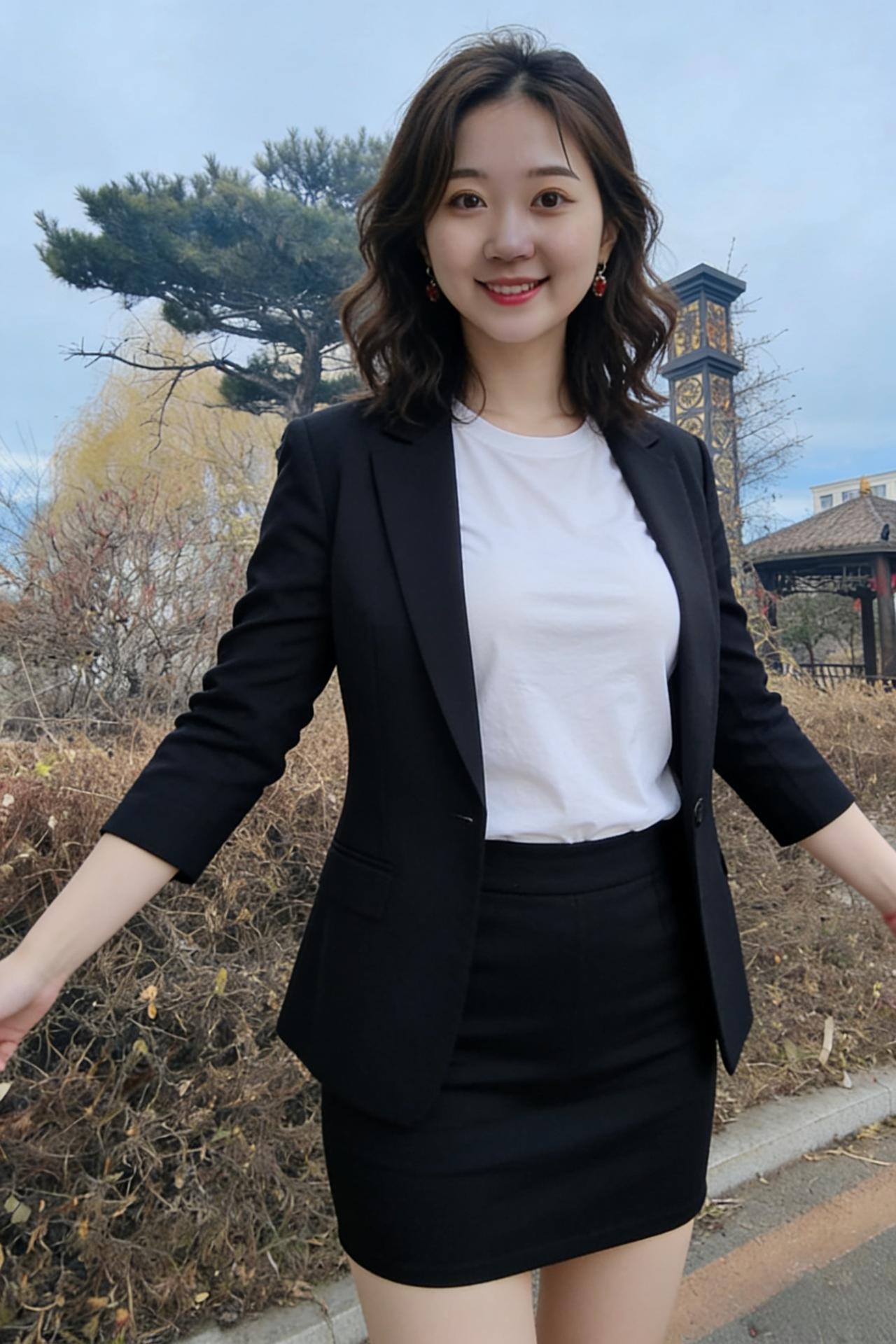 西装裙裹着职场的规矩 白T恤却漏出旷野的风 她站在枯枝与亭台之间 一半是写字楼的干练 一半是郊野的自由 ~ 耳环晃着 是职场里的星子 笑容绽开 是郊野里的花 晚秋的风 掀动西装的下摆 像掀动生活的两面 一面是报表与会议 一面是落叶与晴空 ~ 她伸手接住 一片飘来的黄叶 也接住了 职场与自然的和解 在规矩里 活成舒展的模样