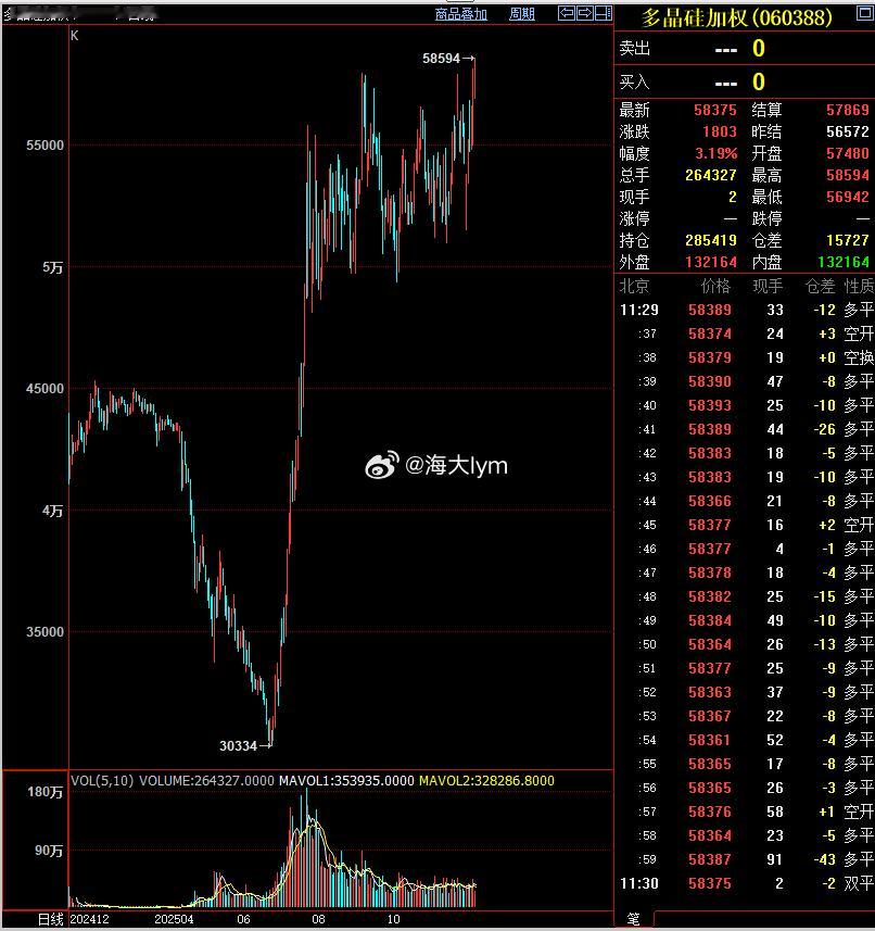 多晶硅期货加权指数上午创历史新高,太强了……多晶硅期货 多晶硅主力合约2605上周一开盘价5万,今天上午收盘价接近5万8,五个半交易日回升大幅高达8000点(16%)