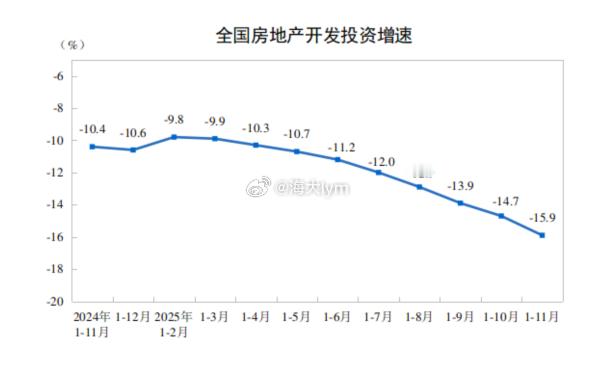 国家统计局:2025年1—11月份,全国固定资产投资(不含农户)444035亿元,同比下降2.6%;其中,民间固定资产投资同比下降5.3%。从环比看,11月份固定资产投资(不含农户)下降1.03%1—11月份,全国房地产开发投资78591亿元,同比下降15.9%(按可比口径计算,详见附注6);其中,住宅投资60432亿元,下降15.0%