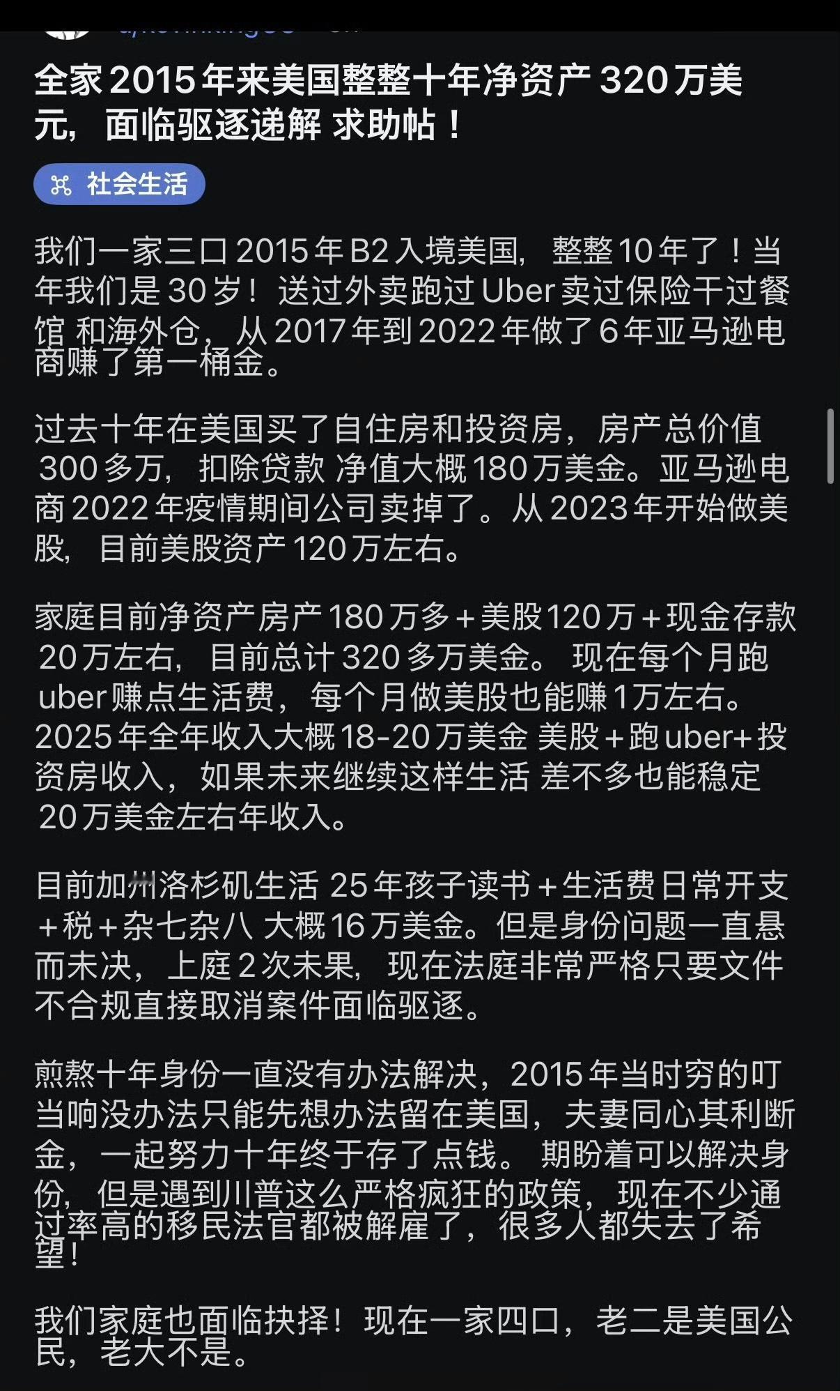 中国人一家四口黑美国10年,积攒2千多万资产,搞不到身份面临被遣返。他们2015年通过B2入境美国,刚开始是三个人,在美国生了二胎,一家四口只有这个小孩有美国户口,在美国严厉的移民政策下面临被遣返。 他们的经历可以说是移民美国奋斗的缩影,他们能吃苦,也有经营头脑。最早送外卖,有一点积蓄了就跑Uber,抓住第一波网约车红利,后面做保险。跨境电商兴起,他们抓住这个机会和国内企业合作,做亚马逊美国仓,成功赚到了第一桶金。 经过10年的积累,在美国买了300多万美金的大房子,贷款120万。手上的美股资产120万,现金20万,目前主要靠投资和开Uber为生,每个月1-2万美金收入,生活安稳、富足。 在美国已经上了两次移民法庭,都没有拿到绿卡,因为川普政府的严厉移民政策,他们可能将被遣返,目前在犹豫纠结中,到底是继续等待,还是移民第三国,变现资产走人,开始新生活。 大儿子学校成绩很好,可以考上美国名校,小的孩子有美国身份,也不想放弃他,所以还在纠结当中。 有网友建议,网上发帖卵用没得,拿出资产的一部分,找律师,努力拿身份,这才是正途。