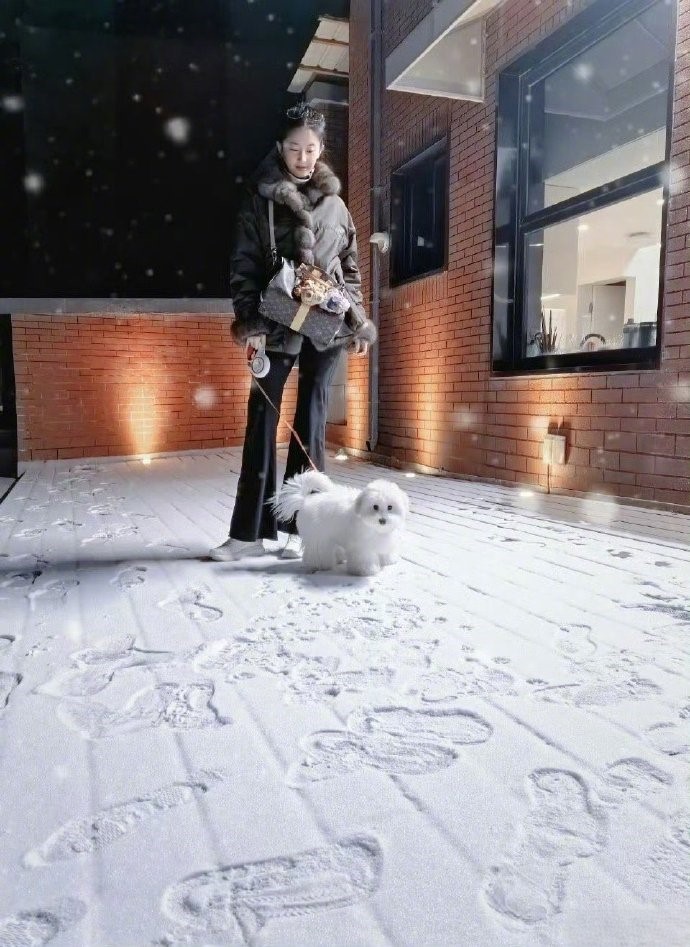 刘亦菲晒初雪哈哈合照 这个状态也太好了吧,狗狗也好可爱呀