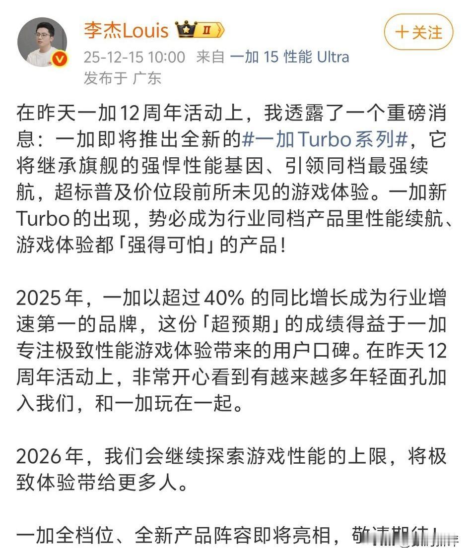 一加也官宣新机了!新系列turbo机型下个月发布!可能抢先红米turbo5系列发布,有一说一一加的机型越来越多了 对销量帮助还是比较大的[捂脸]一加turbo机型主打游戏、续航、性能等等,和友商定义一样,那么9K毫安电池少不了吧[奸笑]次旗舰芯+金属边框+短焦指纹,2199起售?1999起售有点困难,因为内存涨价的原因,不过首发价立减200来到1999还是很有诚意的!