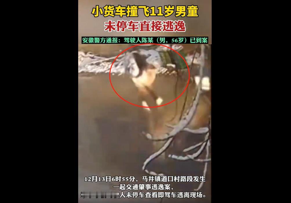 2025 年 12 月 13 日 6 时 55 分,安徽萧县马井镇道口村路段,56 岁的陈某驾驶小货车将横穿马路的 11 岁学生张某某撞飞,未停车查看即逃逸。 张某某面部轻微擦伤,已送医且情况稳定。警方接警后迅速锁定陈某,目前其已到案,案件正侦办中。 陈某这司机的良心哪去了? 撞了 11 岁的孩子,别说下车救人,连停都不停直接跑路,是怕担责还是心里根本没一点人性? 幸亏孩子只是擦伤,要是伤重没及时救,他这辈子都别想安生! 法律早有规定,肇事逃逸不管轻重都得重罚,吊销驾照终身禁驾是标配,搞不好还得蹲大牢,真以为能逃掉? 孩子出事,我们不知道孩子的监护人哪去了。 11 岁孩子大清早横穿马路,身边没大人看着? 虽说司机逃逸可恶,但小孩过马路没人盯梢,这本身就是把孩子往危险里推,监护人的责任也别想甩! 当然,这里还需要该查查这路段的问题,村口路段是不是没减速标识、没预警设施? 之前多少农村事故都是因为路况配套跟不上。 总之,司机驾车要仔细认真,真出了事,别存侥幸,逃逸只会罪加一等; 家长呢,一定要看好娃,别让监护缺位,否则出了事再后悔也晚了; 这里也有路政要及时补漏洞,别让村口成 “虎口”,吞了无辜人的生命!