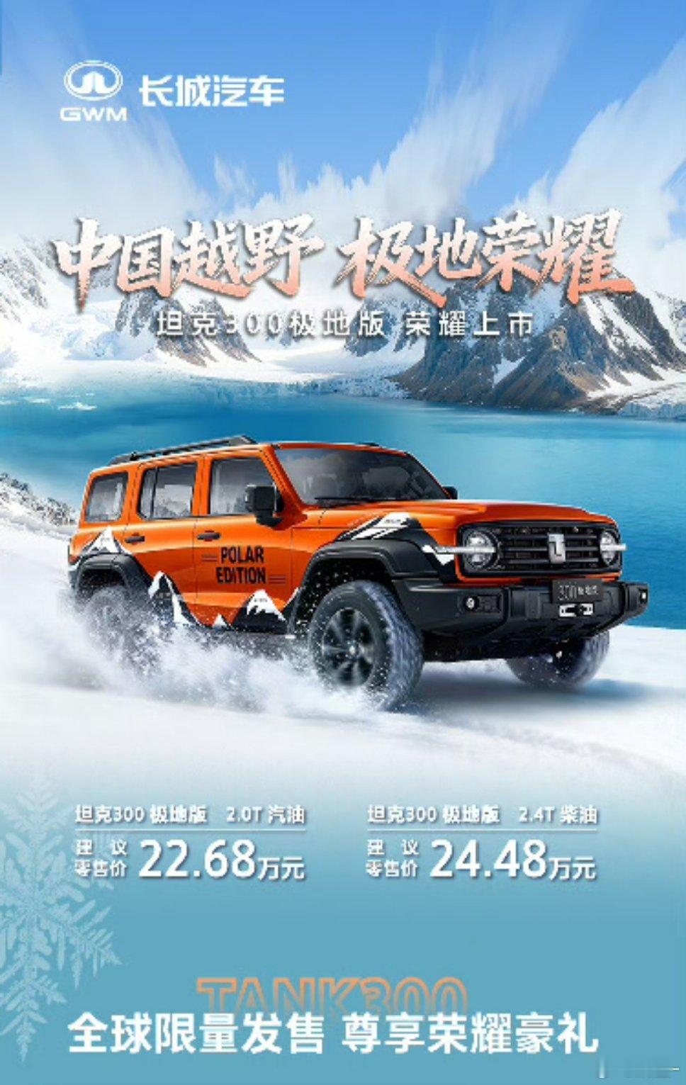 坦克300中国越野极地荣耀坦克300极地版来了2.0T汽油22.68w,2.4T柴油24.48w官方认证“中国南北极考察选用产品”,伴随“雪龙 2 号”科考船远征南极,承担陆地保障任务专属“极地橙”车色、“极地荣耀”徽章与“极地锋芒”拉花,还有前风挡加热、雨刮喷嘴加热、AT全地形轮胎、电子遥控绞盘等配置,真是武装到了牙齿说实话,广州车展现场我真想订一台,但坦克的小伙伴和我说新车实在太火爆,300辆限额15分钟就售罄了坦克300全球累计销量突破50万台