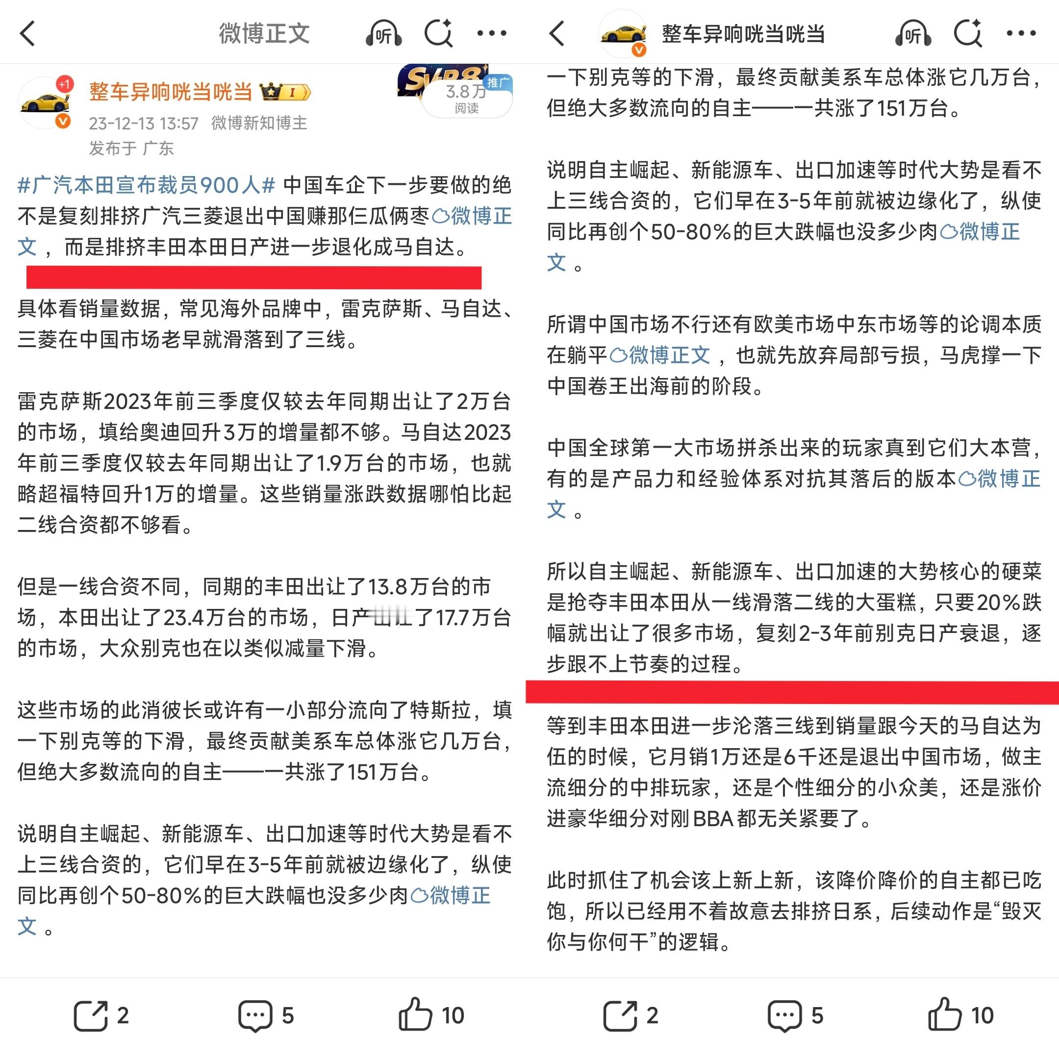 很多人说国家发文禁止亏本卖车是为了稳住竞争弱势的末流车企和品牌不倒闭,事实上却是,在加速下滑通道中的车企和品牌收缩销量。2023年我就详细解释过,新一轮车市竞争,核心不在吃马自达起亚等已经沦为弱势的车企的减量,而在趁着丰田本田没跟上技术趋势的窗口期,抢它们从销量头部衰落成腰部出让的市场。那么价格战和禁止亏本卖车,在其中扮演什么角色呢?众所周知,前年到去年,比亚迪带头掀起的油电同价和电比油低两轮价格战,已经在事实上做完了把渠道铺进合资深耕的下沉市场,并开拓把新能源车卖给当地燃油车拥趸型消费者的过程。丰田本田为首的合资们,新能源车没做起来,销售主力还是靠燃油车,保市场的唯一手段仍然只有降价这一张牌反反复复的出,或者叫不得不卷进价格战。这造成了合资车现在动不动就五万多块钱的优惠,消费者擅长砍价的话,还能下更多的价格不透明的现状。我们换到品牌方和4S店视角,相当于价格不透明,对消费者见人下菜碟,是合资车企和4S店在价格战里刨利润的重要手段。市监局此次拟要求汽车全部明码标价,相当于断绝了这部分利润来源。具体说各品牌:大众丰田仍然在头部位置,小店要么在小城市局部垄断保利润,要么以价换量到其他品牌销量中等店水平,渠道盈亏有保障。恰恰是本田之类头部滑落腰部的合资,小店更加濒临亏损线,退网跑路清仓,库存结构失衡现车甩卖,0公里二手车之类以往赖以获利的手段,被明码标价新规一打,形成要么大亏退场,要么涨价放任销量下滑波及总盈利的两难,很容易造成渠道数量与质量的坍塌。至于马自达之类小体量合资,门店数本来也没多少了,门店之间的厮杀并不激烈,明码标价对它们的影响并不大。今年广汽和东风的财报利润都不好,可见这个现象对相关企业的影响有多大。自主品牌的燃油车,虽然也是4S店加优惠的这套玩法,但优惠金额毕竟只有一两万,明码标价对其的影响远不及合资那么大。更别提现在新能源普遍已经落地了全国统一,价格透明了,新规要求本身已经落地,对新能源没啥威胁。市场竞争不会随明码标价消失,相反对谁价格站不住的考验会更大:涨价丢量损失利润,和清仓退场损失利润,总得选一个。外资豪华车在华遇冷大v聊车