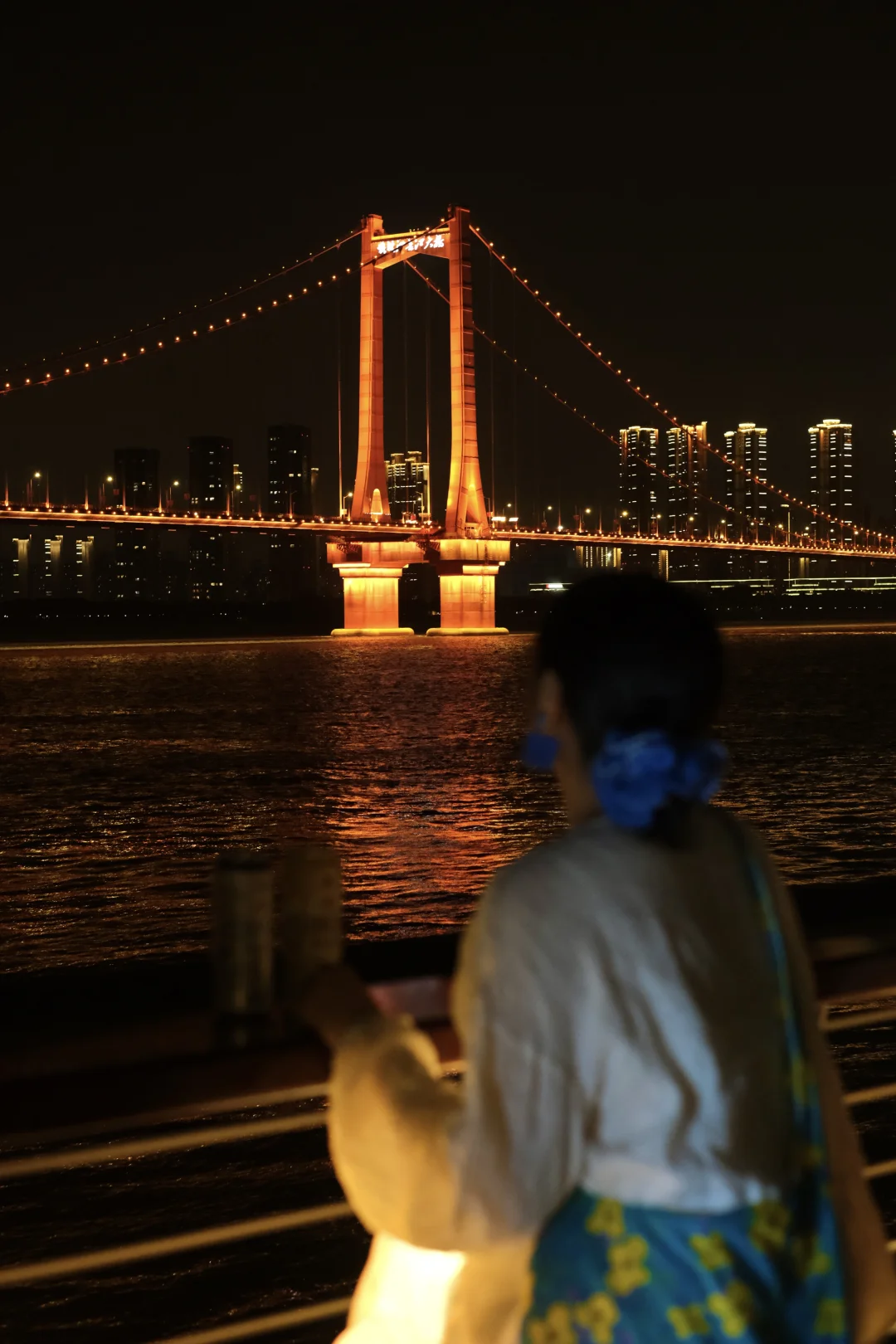 近距离赏橙色鹦鹉洲长江大桥夜景
