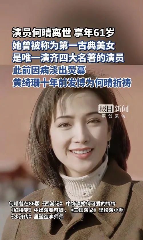 12月14日清晨,电影人余泳的一条朋友圈让全网炸锅:“何晴走了,那个演遍四大名著的古典美人,终究没熬过这个冬天。” 而比讣告更戳心的,是她生前最后一次公开访谈里的一句话:“我和许亚军现在是最好的朋友,儿子家长会都是手牵手进去的。”