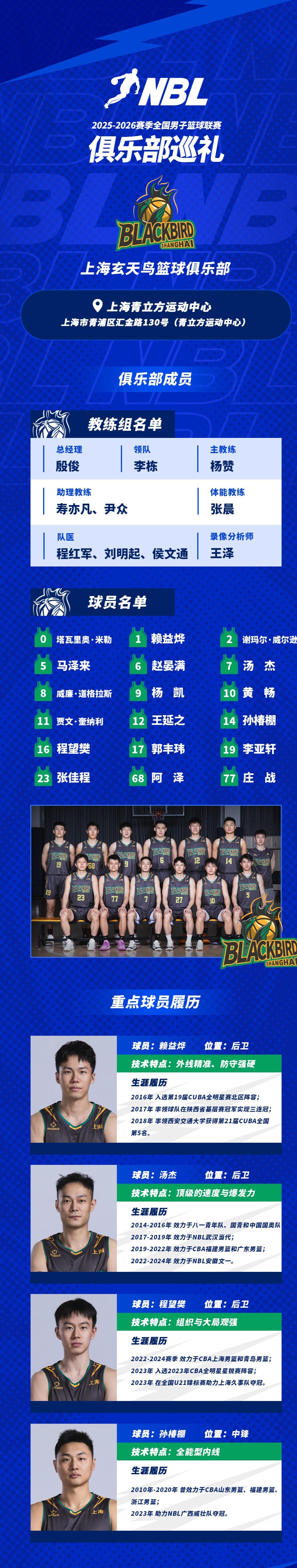 虎扑12月15日讯NBL官方发布上海玄鸟俱乐部球队巡礼。